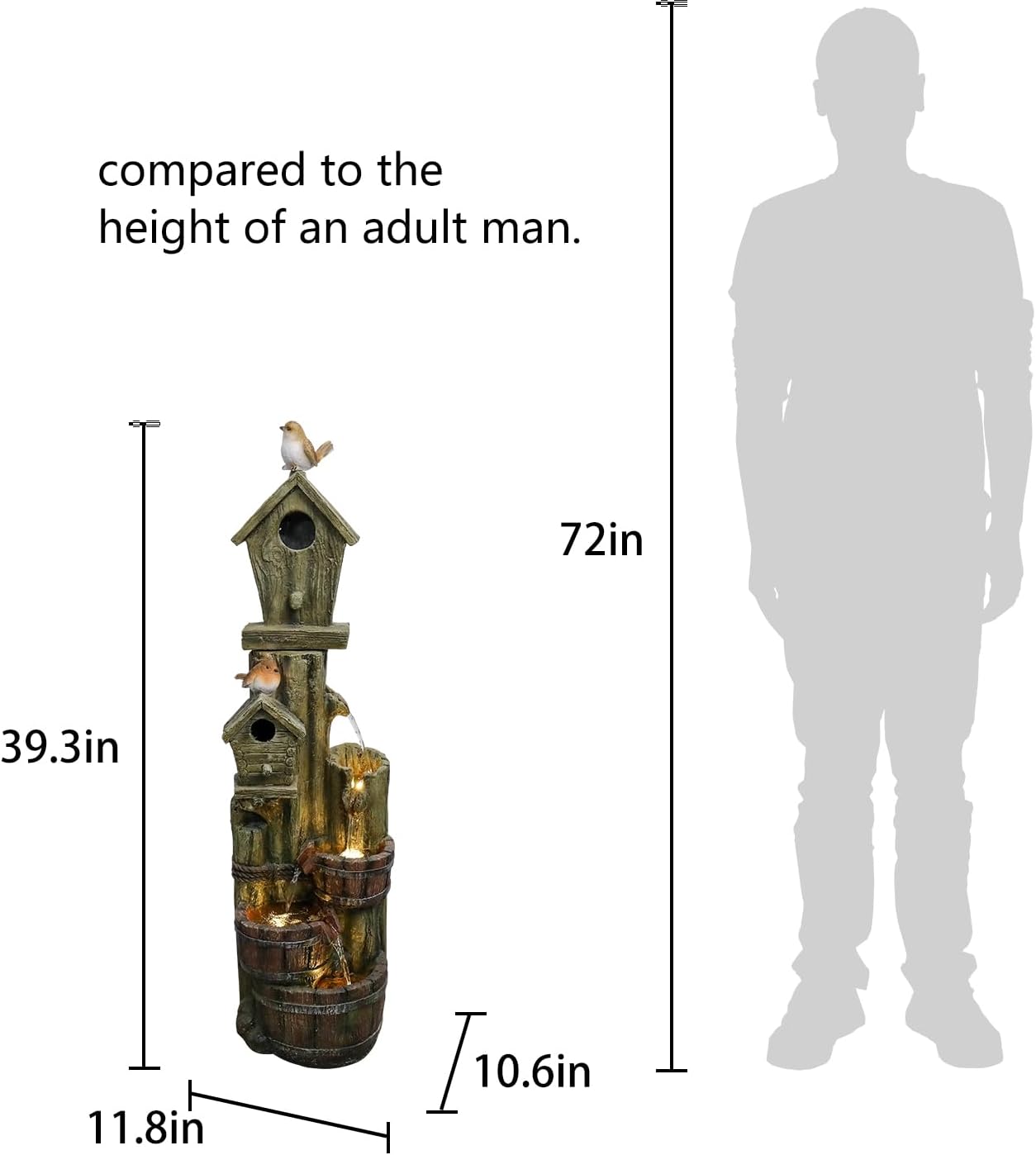 Outdoor Water Fountain with Birdhouse, 39.3inches Rustic Outdoor Water Fountains - Outdoor Cascading Waterfall with Decorative Birds & Buckets, Pump & Lights for Backyard Patio Decor
