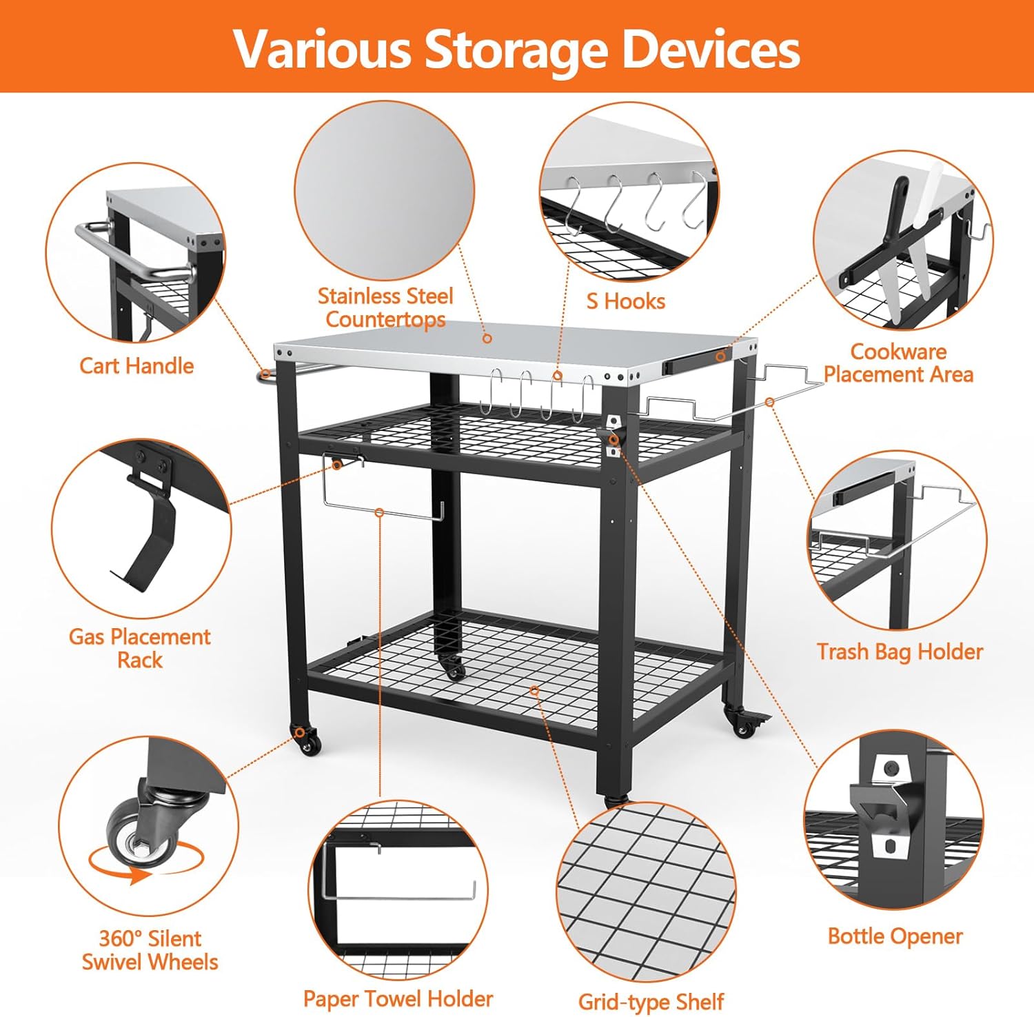 • [Ample Storage Accessories, Well Organized]: The outdoor prep table provides a rich variety of storage accessories, including paper towel holders, cart handles, bottle openers, racks, 10 S-hooks, cookware placement area, garbage bag rack, providing ample storage space for your cooking tools and kitchen items