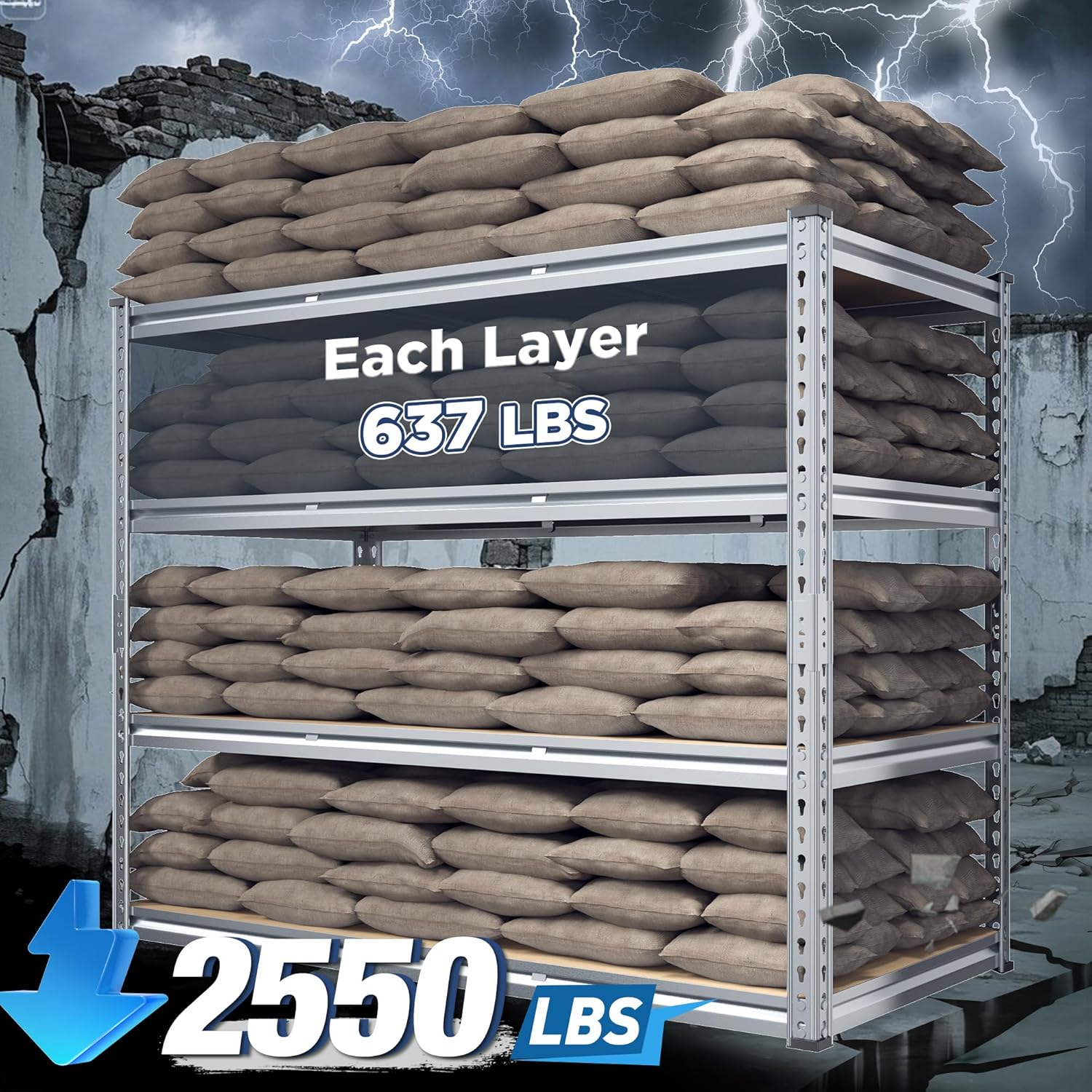 • 【Garage Shelving - 2550LBS Capacity】REIBII garage shelves are built like a tank! Thick steel legs and chunky boards can carry 637lbs on each shelf – that's 2550lbs total! Suit for stacking toolboxes, car parts, or even your camping gear. No wobbling, no bending, just rock-solid storage