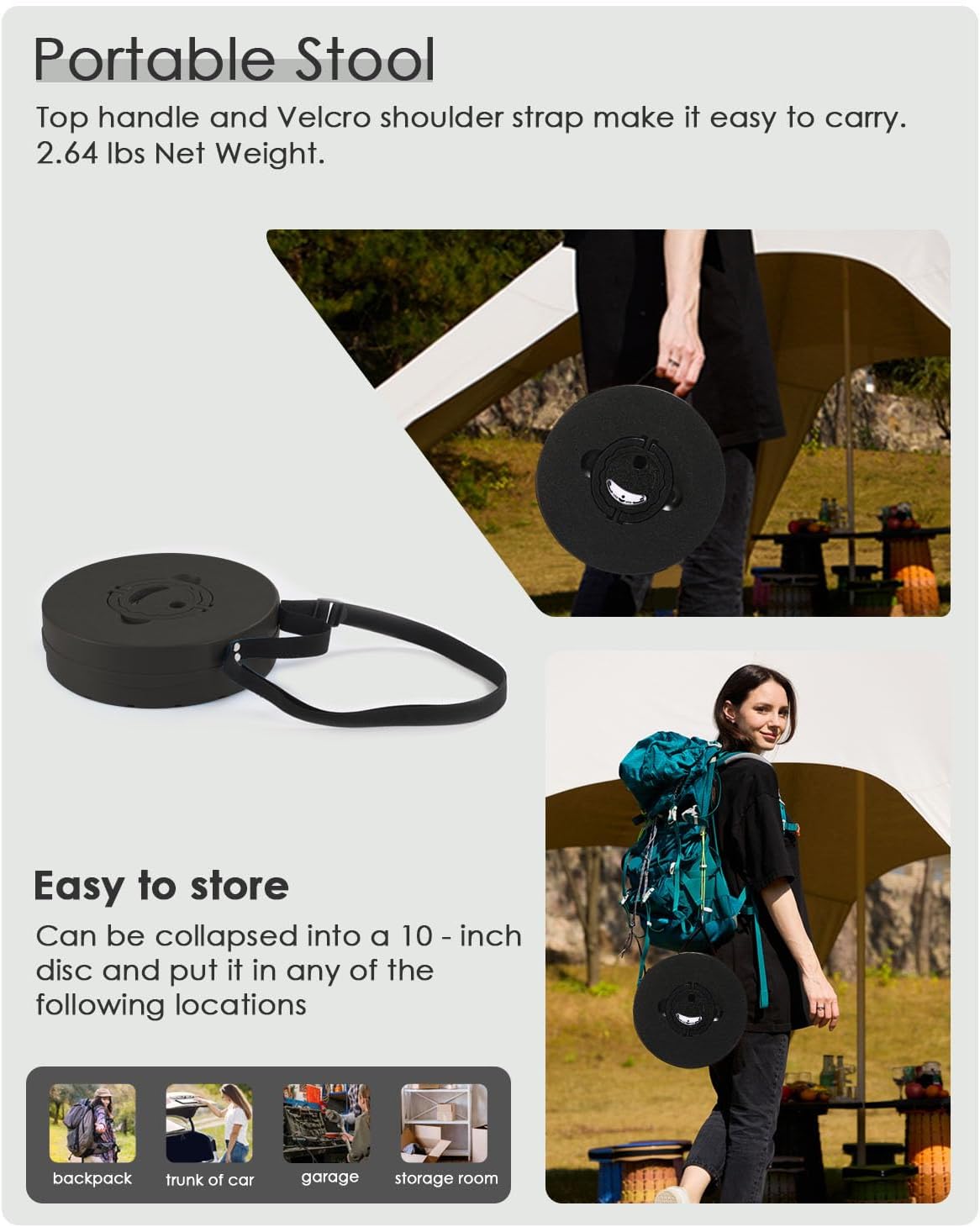• LIGHTWEIGHT PORTABLE FOLDING STOOL – Only 2.64lbs! Folds compact to 10.2"(D)x2.6"(H) with handle & shoulder strap. Perfect lightweight collapsible stool for backpacks or car trunks.