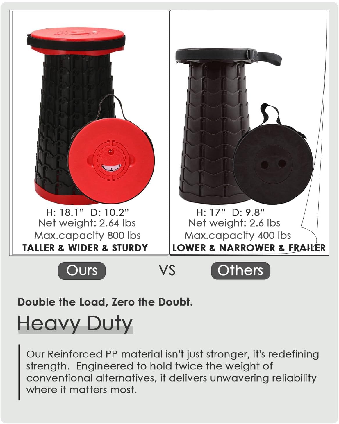 • 800 LBS HEAVY-DUTY CAMPING STOOL – Reinforced PP material, delivers double the industry strength, creating ultra-safe portable stools for adults of most sizes.