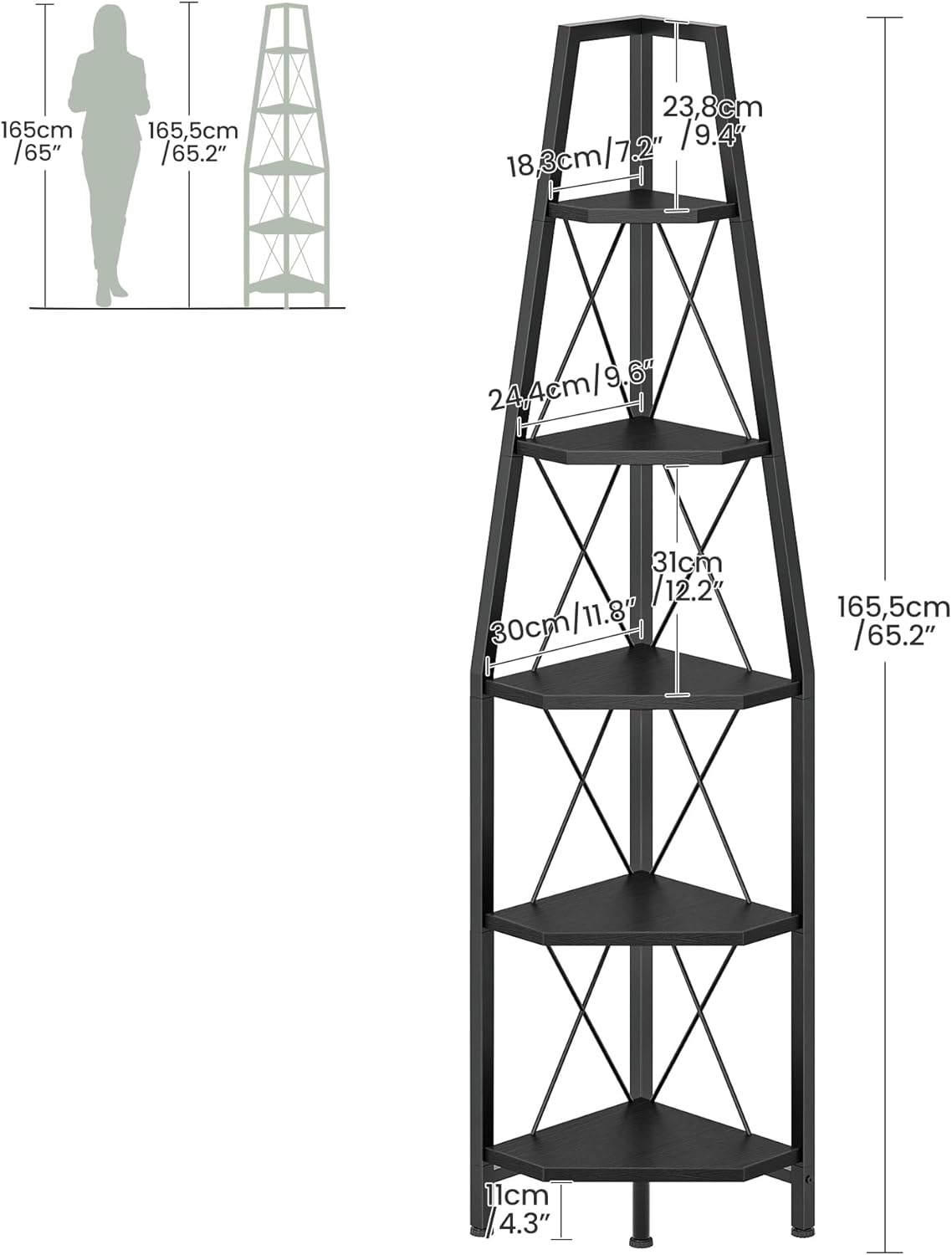 • Maximize Corner Space: Our 5-tier corner shelf measures 11.8''L x 11.8''W x 65.2''H and features a 90° right-angle back design, fitting snugly against walls to maximize unused corners. Its multi-level structure offers ample storage and keeps your space organized