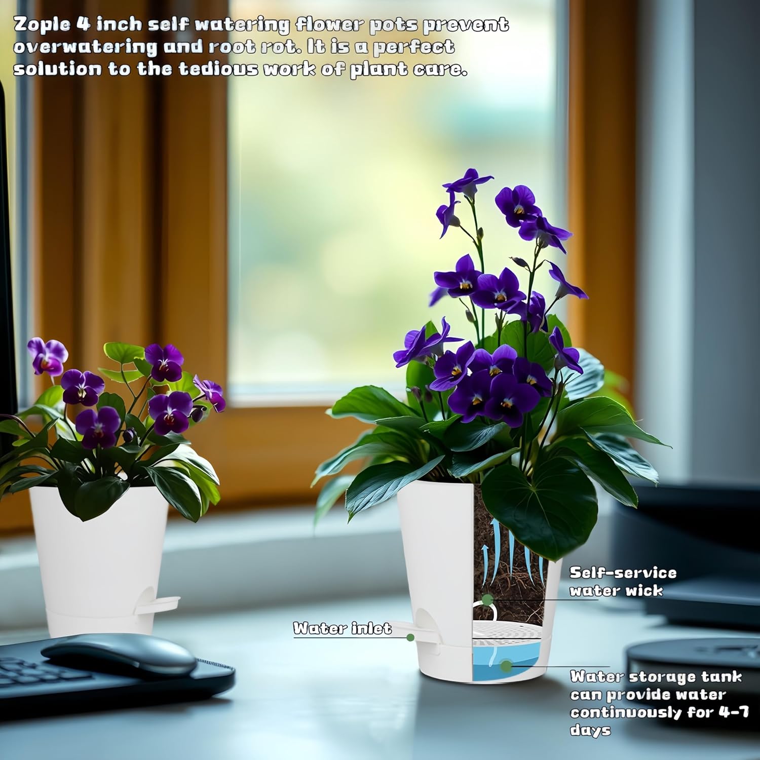 12 Pack 4 Inch Self Watering Plant Pots with Drainage and Saucers,Plastic Flower Pots for Indoor and Outdoor Plants, Nursery Planters for Houseplants and Herbs White, 4 inch 12pcs