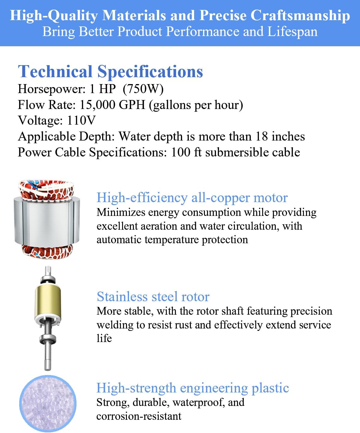 • High-Performance Aeration & Circulation – 1HP motor delivers up to 15,000 GPH water flow, improving oxygen levels, reducing algae, and enhancing water clarity in large ponds and lakes.