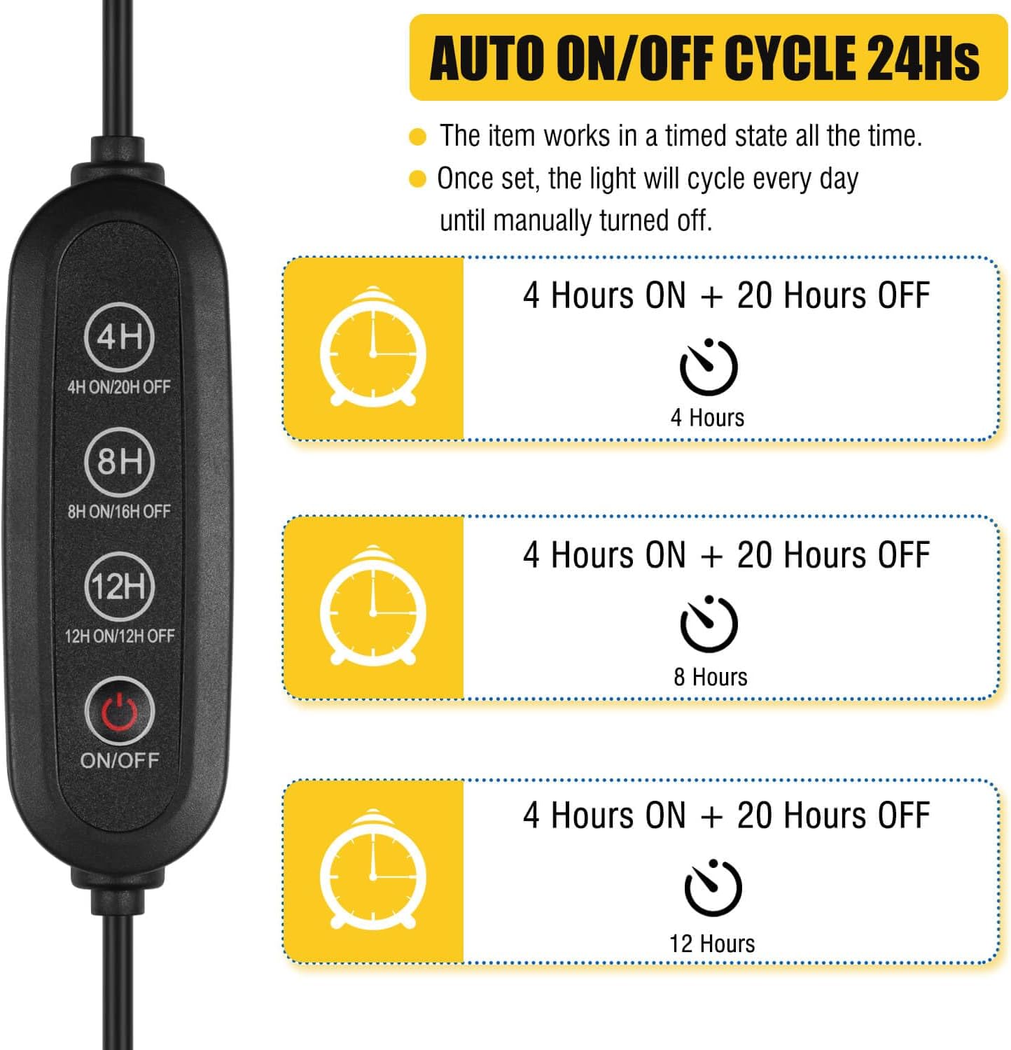 • 【CYCLE AUTO ON/OFF TIMER】The grow light works in a timed state all the time, The timer function of the growth light allows for 4/8/12 Hours timing for plant needs. and it works in a timed state all the time. Once being set up, the grow light will automatically turn off after set hours, and then the plant growth lights turn on and off at the same time on the next day for a 24-hour cycle, copy daily turn on and off times.