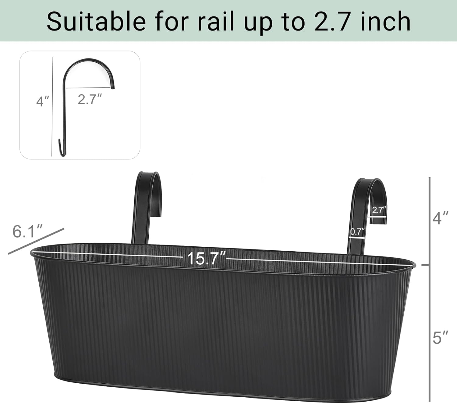 • Note: The package includes three planters and six hooks. Planter is 15.7" x 6.1" x 5". Hook is 4" x 2.7” x 0.7"(Suitable for rail up to 2.3 inch). you need to install the iron bucket yourself when it arrives.