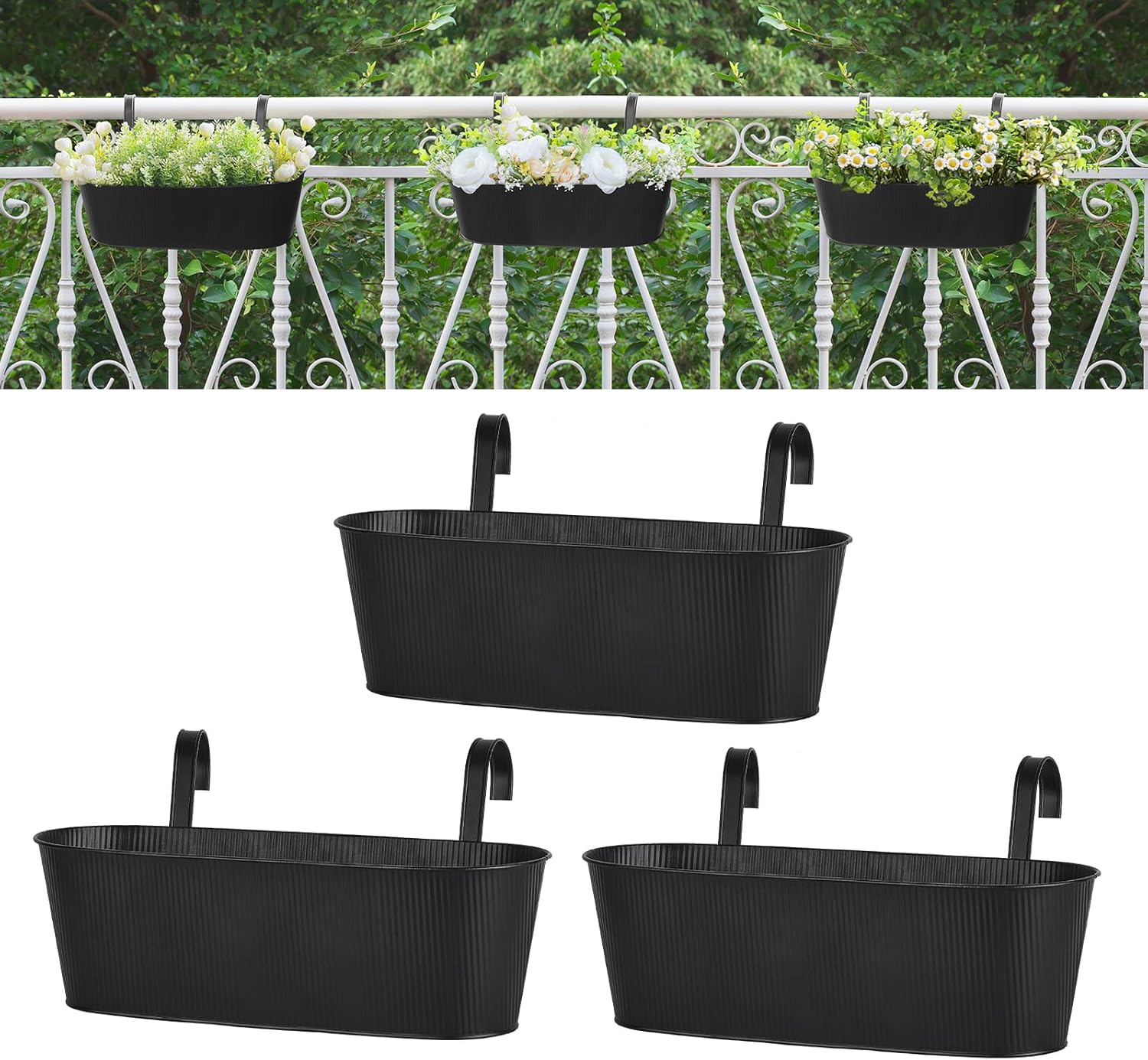 Mkono Metal Railing Planter Box 15.7 Inches 3 Pack Balcony Hanging Planter for Outdoor Plants with Detachable Hooks and Drain Holes Fence Planters for Any Balcony, Porch or Deck (3, Medium)