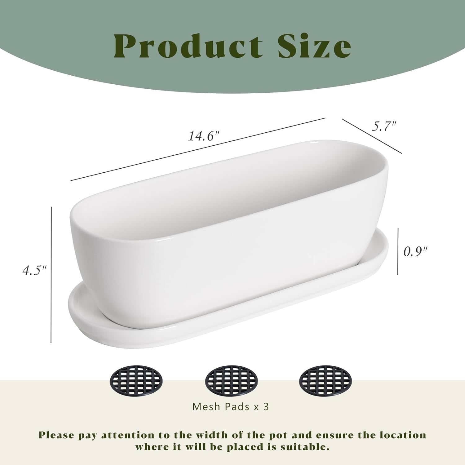 • INDOOR OUTDOOR CERAMIC POTS: 14.6’’ in length, 5.7'' in width, and 4.5’’ in Height. Great for decorating windowsills, tabletops, shelves, bedrooms, kitchens, gardens, and outdoor patios. Smooth inner finish for easy cleaning