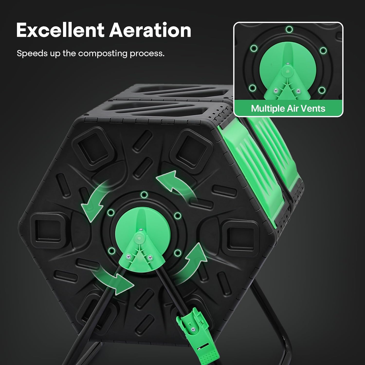 • Stable and Durable Build: Constructed from weather-resistant, BPA-free PP plastic and reinforced with a strong steel frame. This composter is designed to stay upright and stable during regular rotation and outdoor use.
