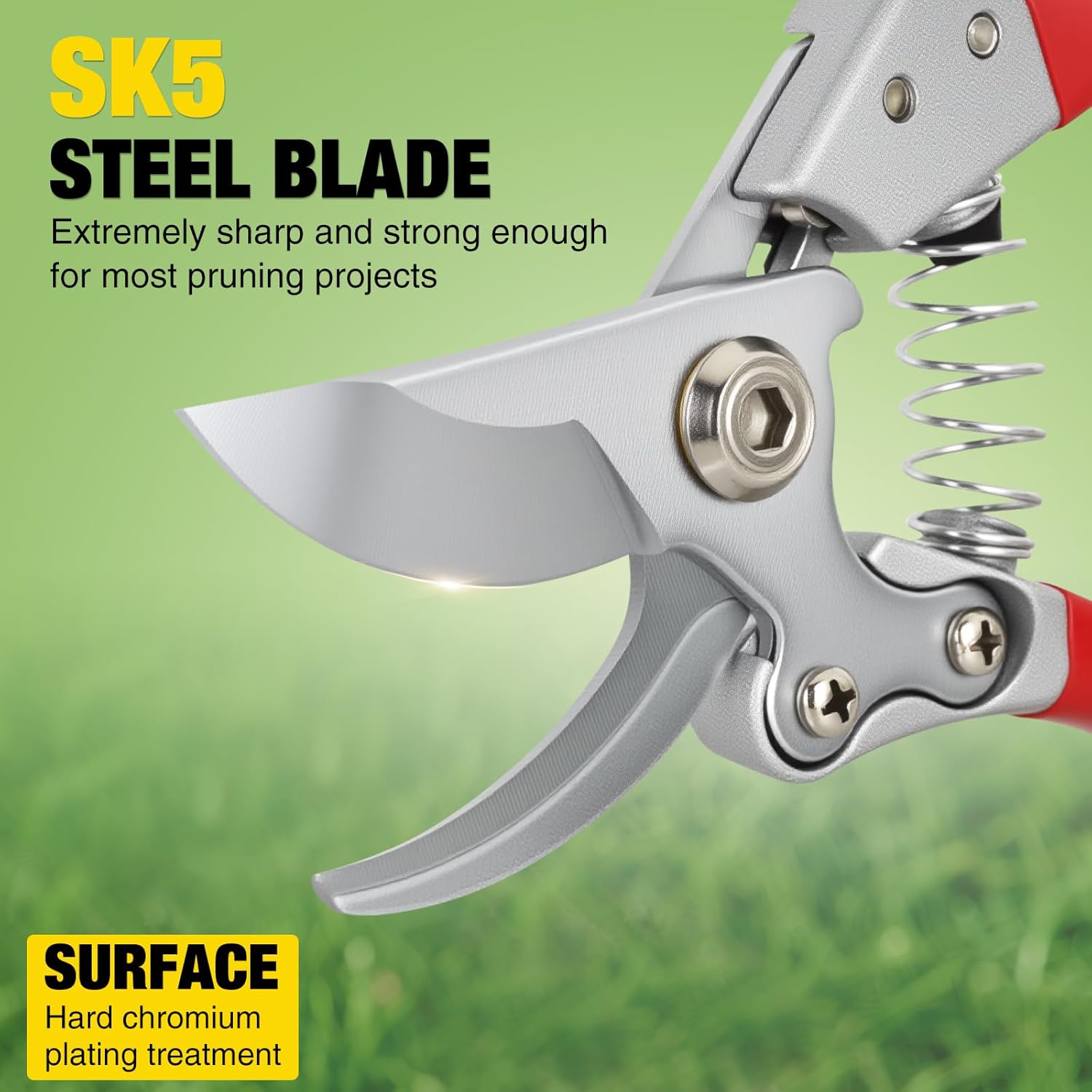 • ULTRA SHARP BLADE: Yesker pruning shears are made of high-quality SK5 steel with a hard chrome-plated surface. They are extremely durable, retain their sharpness and edge, and are rust and corrosion resistant, ensuring smooth and efficient pruning every time. This is the perfect pair of shears gardening tools to easily meet your pruning needs
