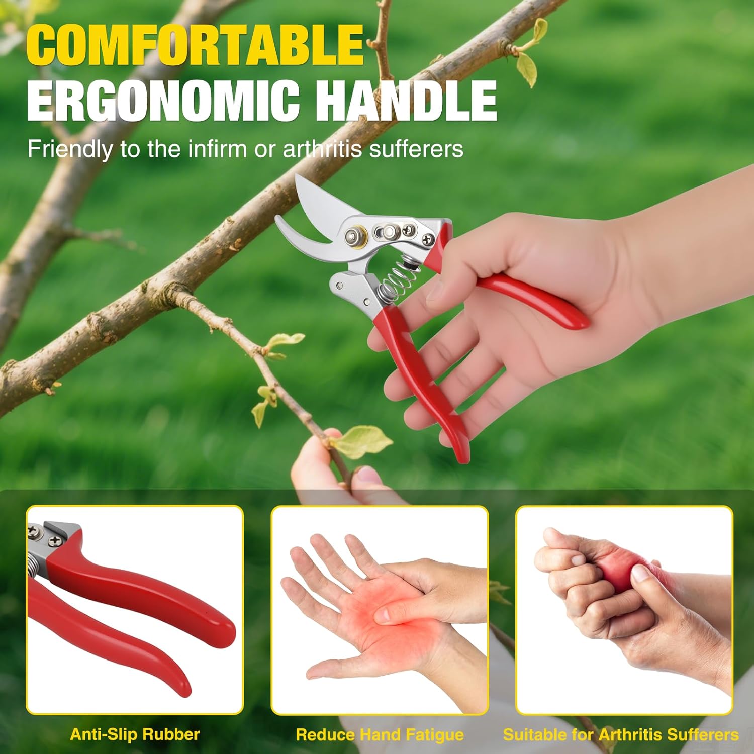 • COMFORTABLE ERGONOMIC HANDLE: The shears gardening tools uses an aluminum alloy handle and non-slip PVC dipped plastic, which is safer and more comfortable, reduces hand fatigue, and is suitable for the elderly and arthritis patients. This pruning shear is suitable for pruning various plants, flowers, picking fruits and vegetables, etc. It is an ideal gift for family, friends and gardening enthusiasts