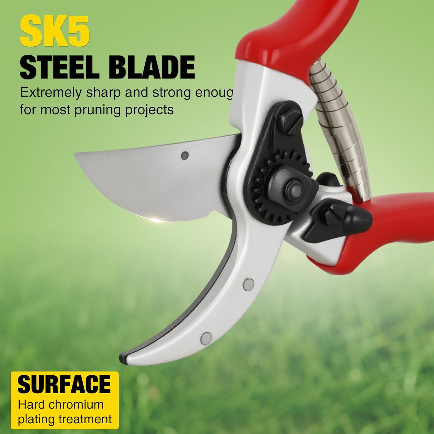 • POWERFUL LOCKING MECHANISM: Our pruning shears for gardening are equipped with a safety lock, which allows you to easily lock and close the blades securely with one hand when not in use, preventing the blades from accidentally opening and causing injury. Whether you carry it in your pocket or tool bag, it provides convenience and peace of mind. Our hand garden clippers are safe and convenient to meet all your gardening needs