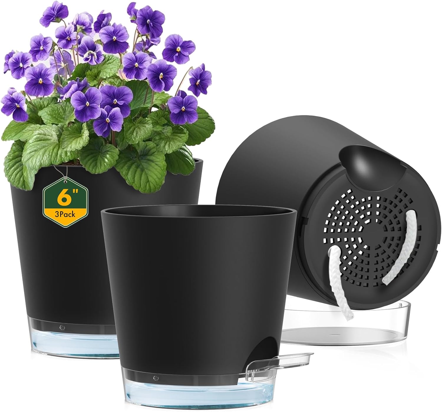 6 inch Self Watering Pots for Indoor Outdoor Plants, 3 Pack Flower Plant Pots with Drainage Holes and Clear Reservoirs, Visible Water Level, Plastic Planters with Wicking Rope, Black