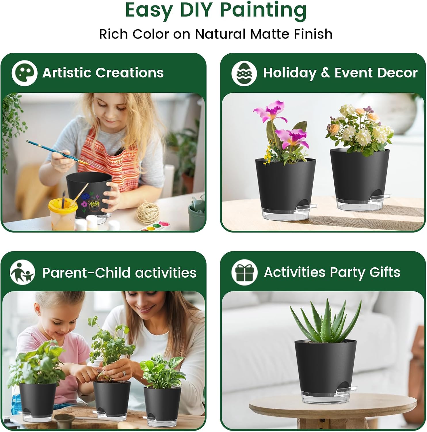 • 【Multi-Purpose and DIY Friendly】These self watering planters for indoor plants are perfect for growing cacti, succulents, aloe vera, african violets, herbs, and snake plants. Spark creativity! Color or DIY these self-watering planters- a fun project to grow plants & memories with kids.