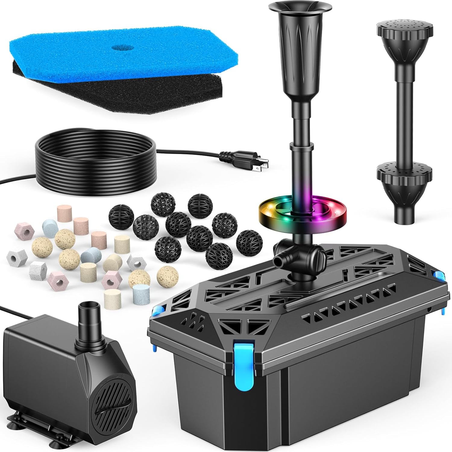 • 🌈【Wide applicability】Pond filters for outdoor ponds widely used in water design scenarios, such as garden fountains, courtyard waterfall landscaping, pond circulation purification, fish pond oxygenation, parks, aquariums, aquascaping, koi ponds, not only to provide sufficient circulation power, but also its efficient filtration system can effectively remove water impurities and organic wastes, for the pond fish and other organisms to create a healthy ecological environment.