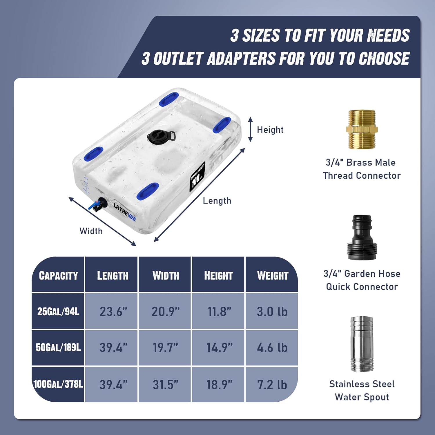 • LARGE WATER TANK: The LATHEVEE water storage bag can hold 25 gallons/94L of water, and the transparent material allows you to observe the water storage situation more intuitively. It can help you organize gardens, water plants, irrigate agriculture, camp, hunt, hike, and provide emergency water for outdoor activities or off grid living