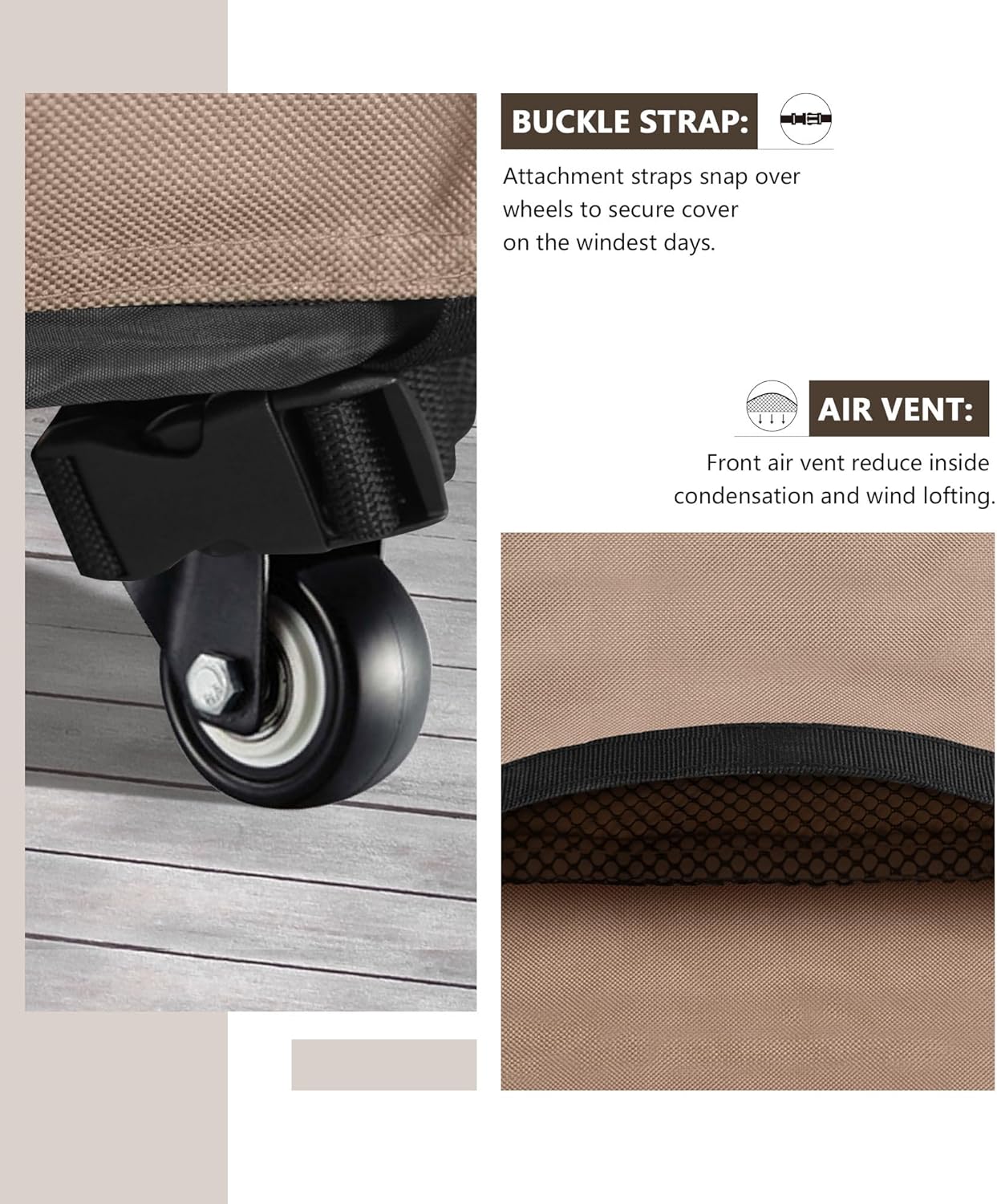 • Well-made structured air vents keep ventilation, prevent the cover from being blown away, also keep your grill equipment dry and in good condition.