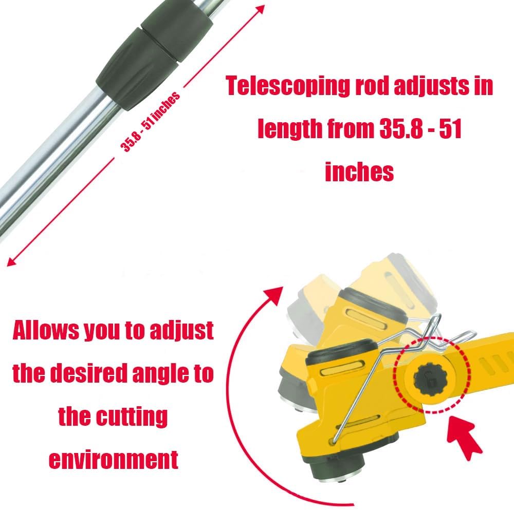 • 🌸【Adjustable Telescopic Design】:Electric Cordless Weeder has an adjustable telescopic pole that can be freely adjusted between 36 and 52 inches, providing everyone with the length they need to work in a comfortable position, reducing stress on the back and shoulders also easy to transport and store. The angle of the cordless weed whacker head can be adjusted from 0 to 90 degrees, allowing you to mow even sloping lawns or hard-to-clean crevices