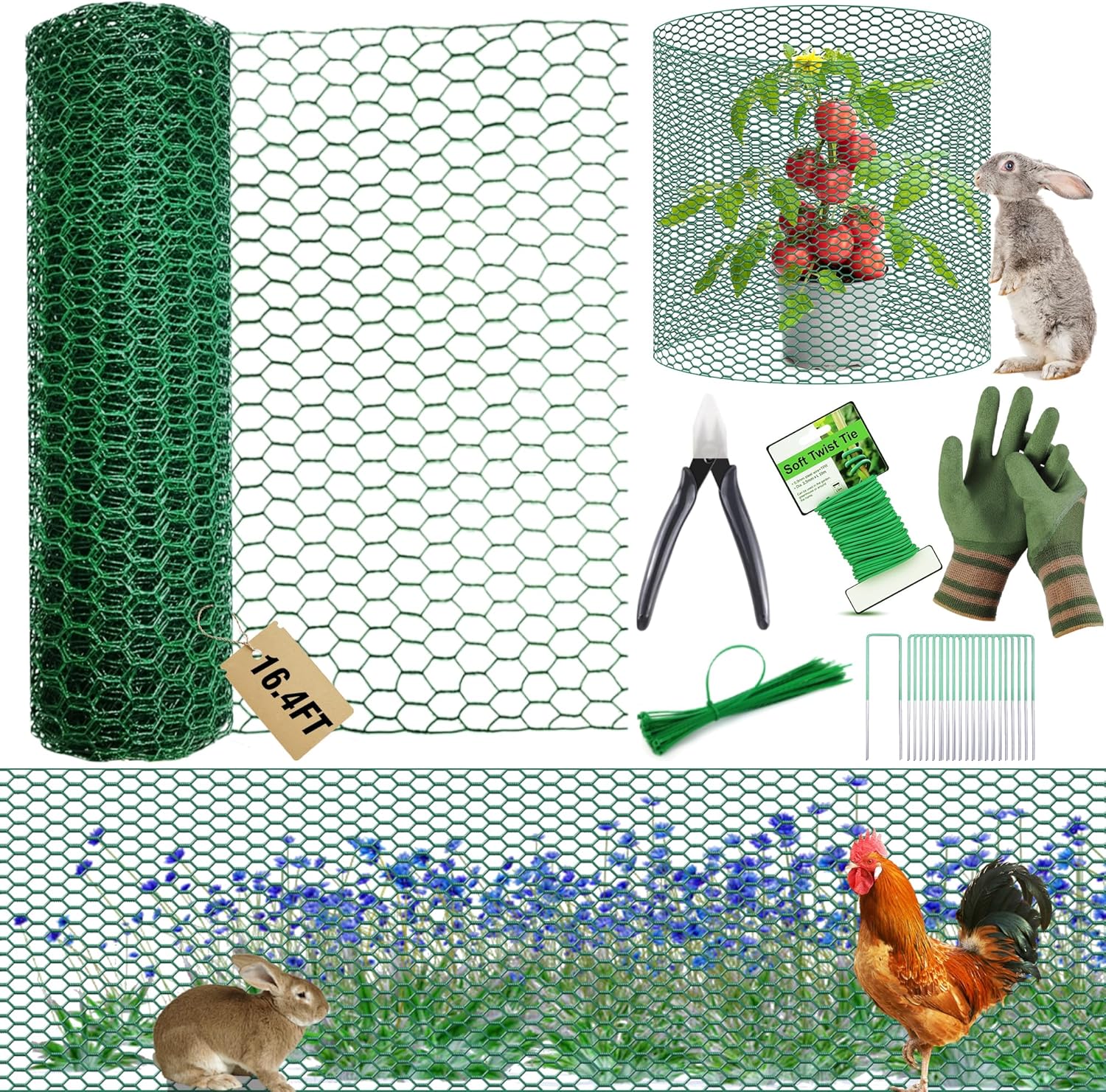 • Included Everything You Need - The wire plant cages kit contained everything necessary to construct optimally sized cages for your plants: a rolls of free-cut wire mesh plant protector panels(16.4ft x16In), cutting pliers, 100 pieces of zip ties, 15 pieces of U shaped garden stakes, 32.8ft of Soft Twist Ties and anti-cut gloves. Meet your daily needs.
