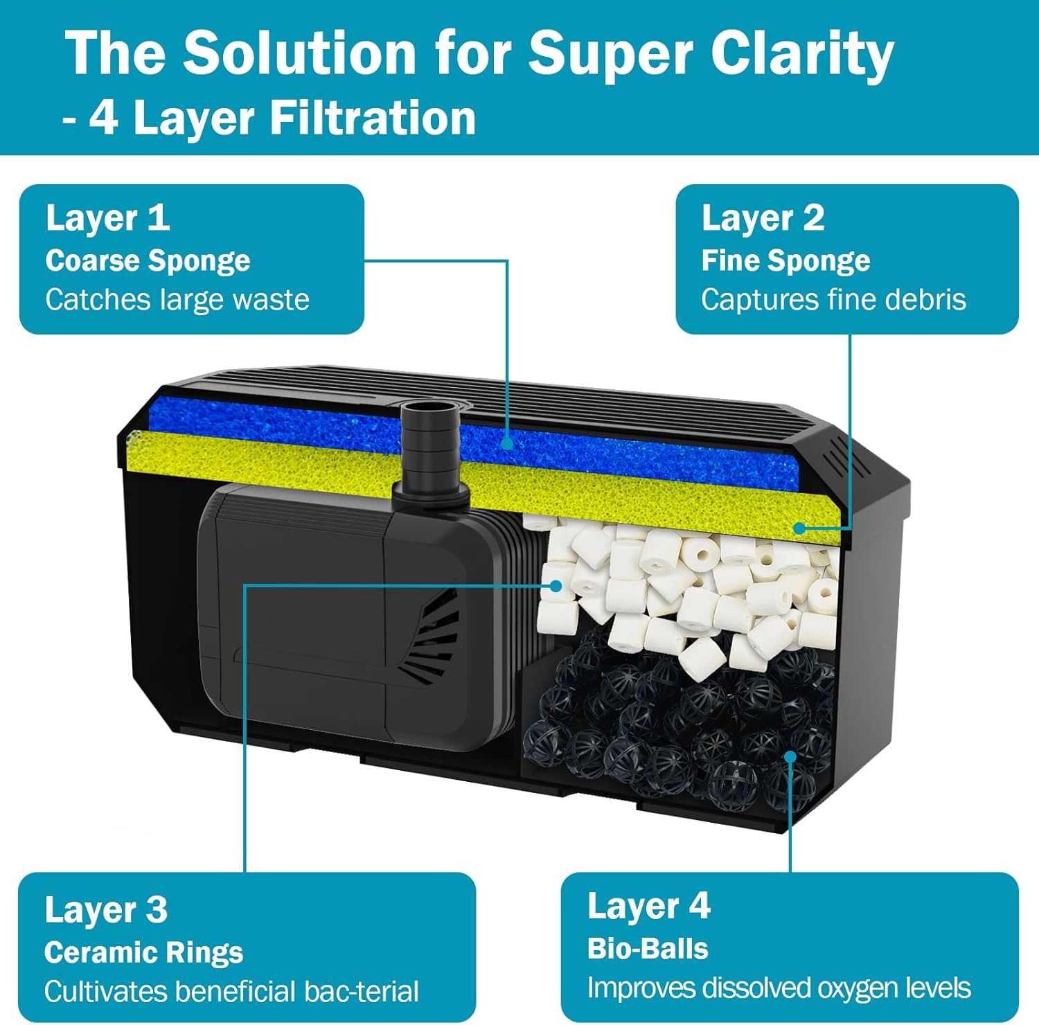 • 4-STAGE FILTRATION SYSTEM – Experience crystal-clear water with this advanced pond pump filter box. Its 4-stage filtration includes: Stage 1 – Coarse Sponge (traps large debris), Stage 2 – Fine Sponge (captures small particles), Stage 3 – Ceramic Rings (promotes bene-ficial bac-te-ria growth), and Stage 4 – Bio-balls (boosts oxygen levels).