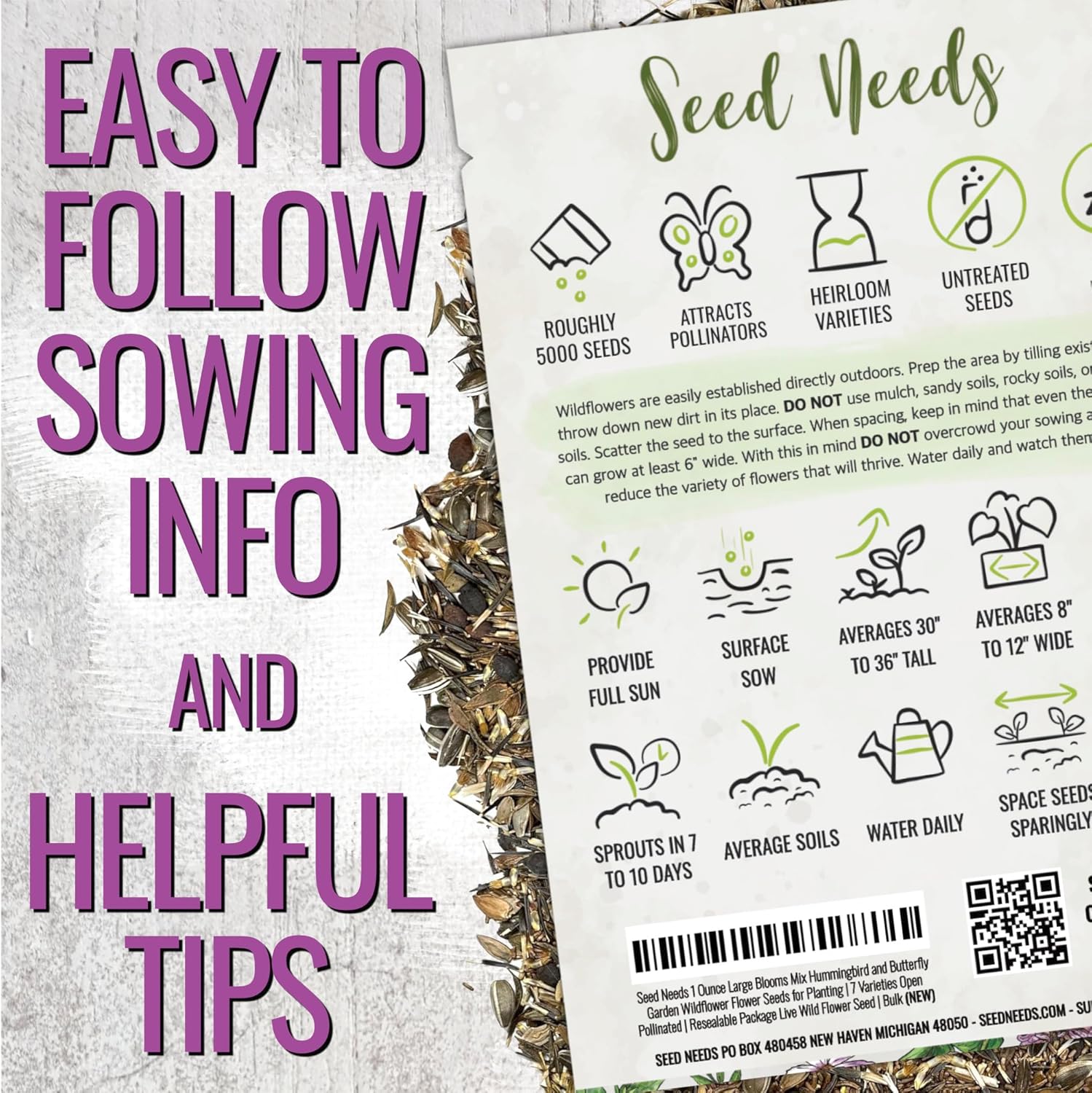 • Freshness: All wildflower seeds are packaged in tear resistant and moisture resistant packaging. This keeps the seeds a whole lot fresher than the competitions selection!