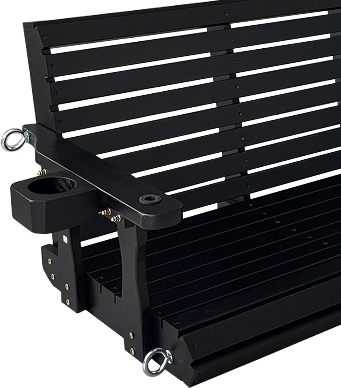 Wooden Porch Swing 3-Seater, High Backrest and Deep Seat, Bench Swing with Cupholders, Hanging Chains and 7mm Springs, Heavy Duty 880 LBS, for Outdoor Patio Garden (Carbon Black, 5 FT Extra Large)