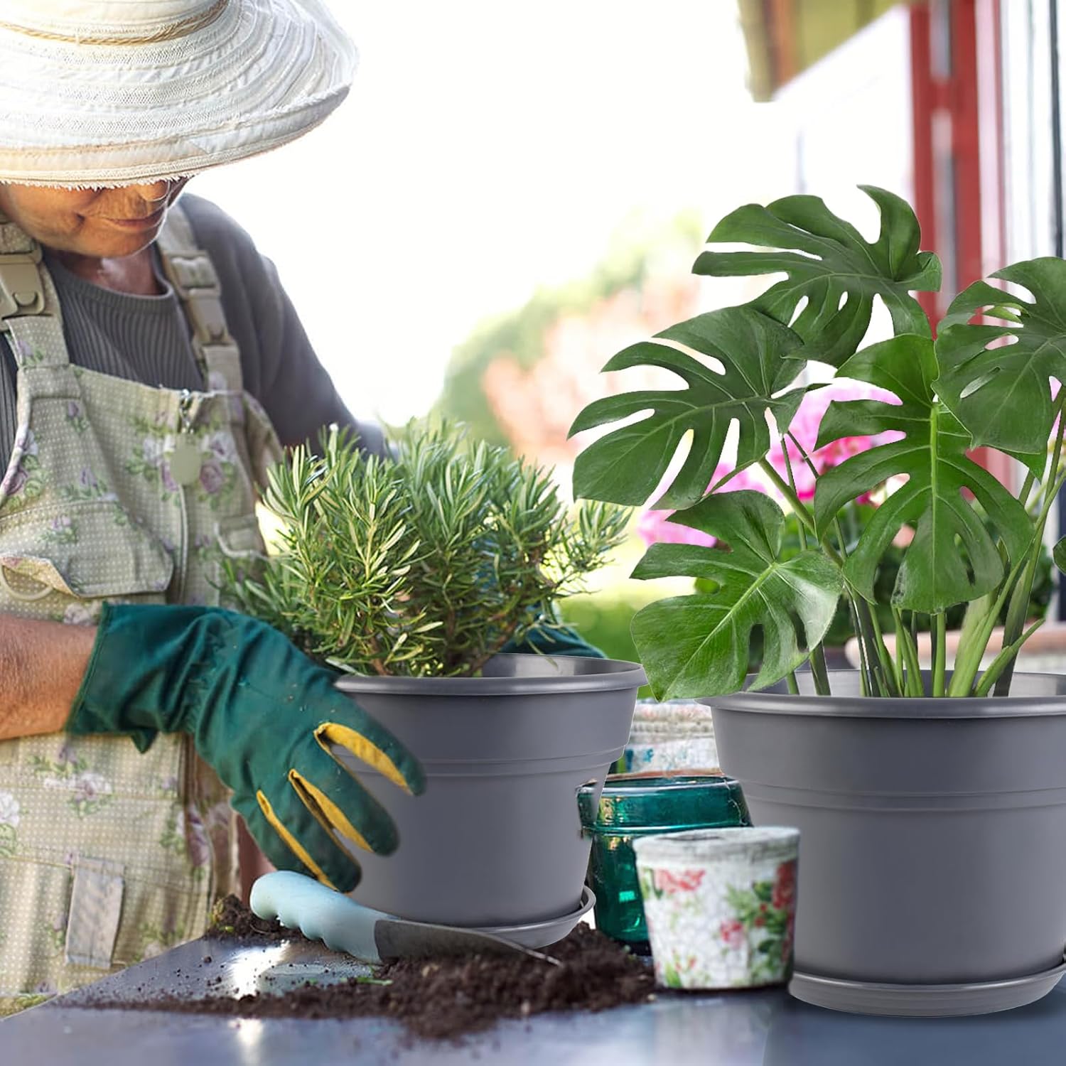• 【Multi - Usage】Designed for versatile use, coming in various size, plastic planters for outdoor plants are perfect for cultivating flowers, herbs, and vegetables, such as Bird of Paradise, Serpentine Moonflower, Majesty Palm, Succulents. These outdoor flower pots set is a perfect gift for your elders, friends and some other who like to decorate garden to enjoy the planting process. Plant pots outdoor is suitable for weddings, birthday, party, anniversary, Christmas, thanksgiving.