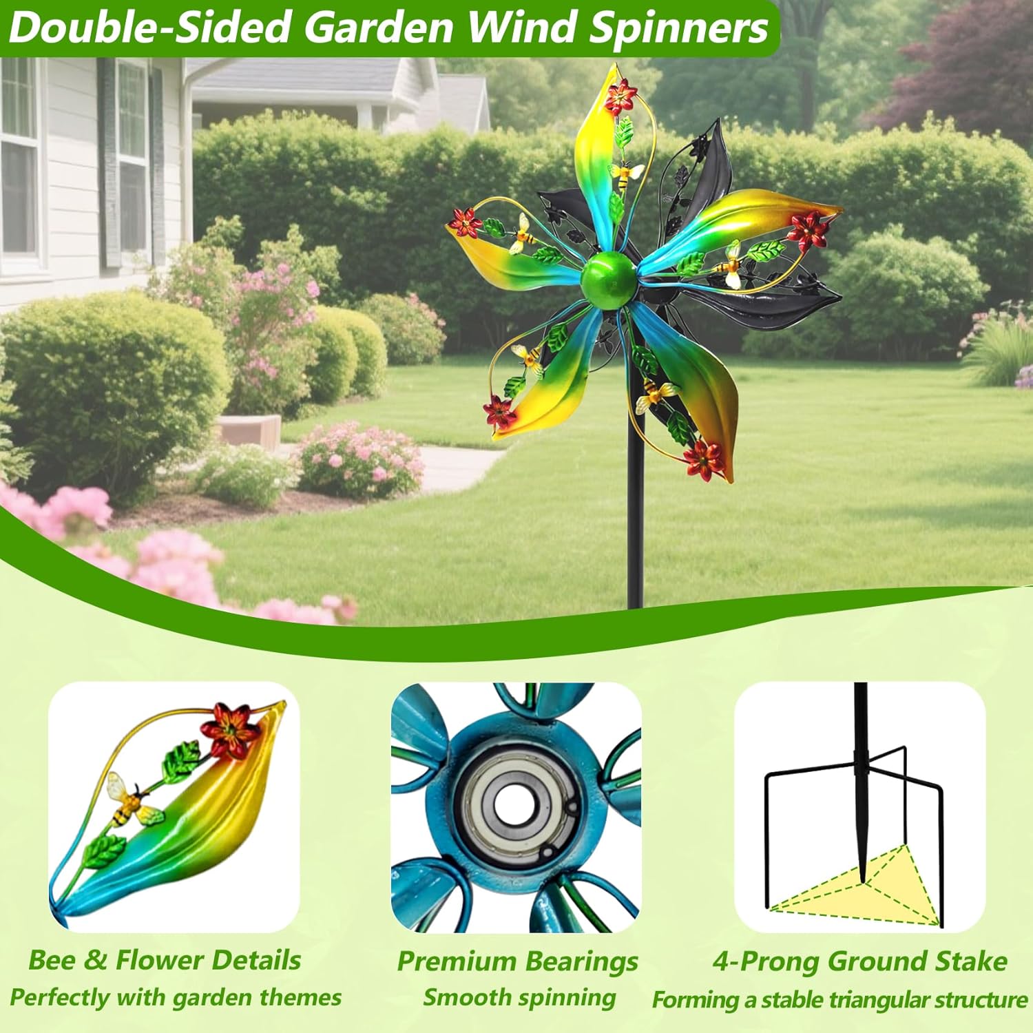 • Double-Sided Kinetic Design: Features two opposing sets of blades that spin smoothly from any direction; The dual-sided design creates captivating motion and adds energy to your yard art