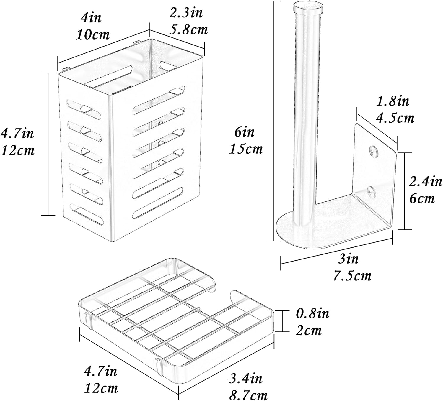 • Included Components : 1 Soap Holder, 1 Tissue Holder, 1 Utensil Holder, 2 Adhesives, 2 Hanging Storage Baskets