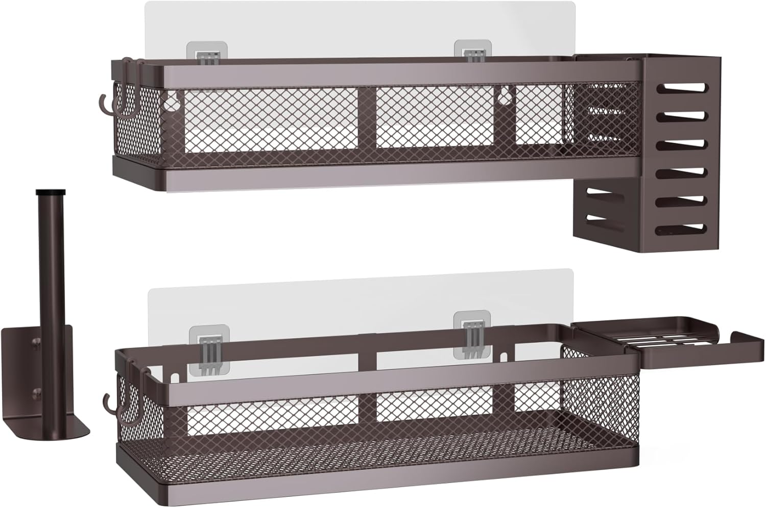 • 【MULTI-PURPOSE&MULTIFUNCTIONAL】5 Hanging Storage Baskets Organizer Set for Sufficient Bathroom Kitchen Storage Space, The bathroom&Kitchen organizer comes with 5 pieces for different uses, including 2 Hanging Storage Baskets, 1 soap holder,1 Tissue holder ,1 utensil holder and 2 adhesives. The perfect solution for organizing a multitude of every items indoor or outdoor. The cabinet organizer hanging baskets wall mount is Ideal for organizing and storing spice bottles, pantry items, snacks, toiletries, tools, craft supplies,etc. And this metal bin basket free up enough space for your homes, kitchen, living room, bathroom, camper, farmhouse, apartments, college dorm rooms, etc.