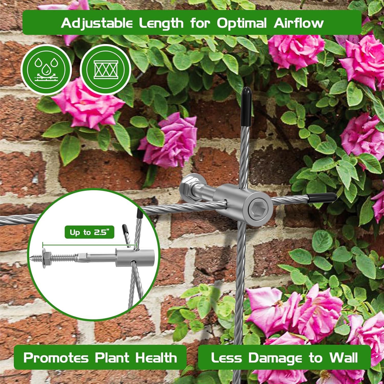 • 「Enhanced Airflow for Plant Health」- The 2.5-inch gap from the wall after installation is designed to prevent moisture buildup, keeping everything fresh yet dry and improving airflow around your plants. This trellis wire kit enhances their health and provides a perfect environment for climbing plants. The 7 x 7 stainless steel cable not only looks great but also provides a reliable surface for plants to grip and climb
