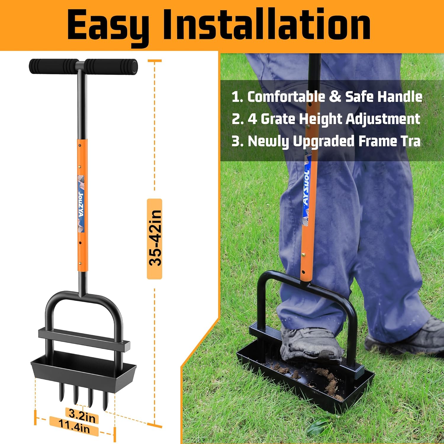 • Built-in Soil Core Tray:The upgraded JouZYA lawn aerator features a built-in soil core collection tray that automatically gathers soil plugs during aeration. It keeps your lawn tidy, reduces the need to bend over repeatedly, and makes lawn care more efficient and hassle-free