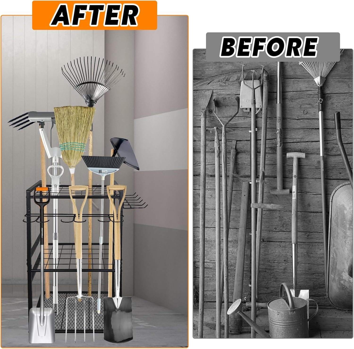• Multifunctional Garage Storage: Garden organizer seamlessly adapts to garages, gardens, sheds, and backyards. It efficiently organizes gardening, yard maintenance, cleaning, and lawn tools. From shovels and leaf rakes to bow rakes, mops, and brooms