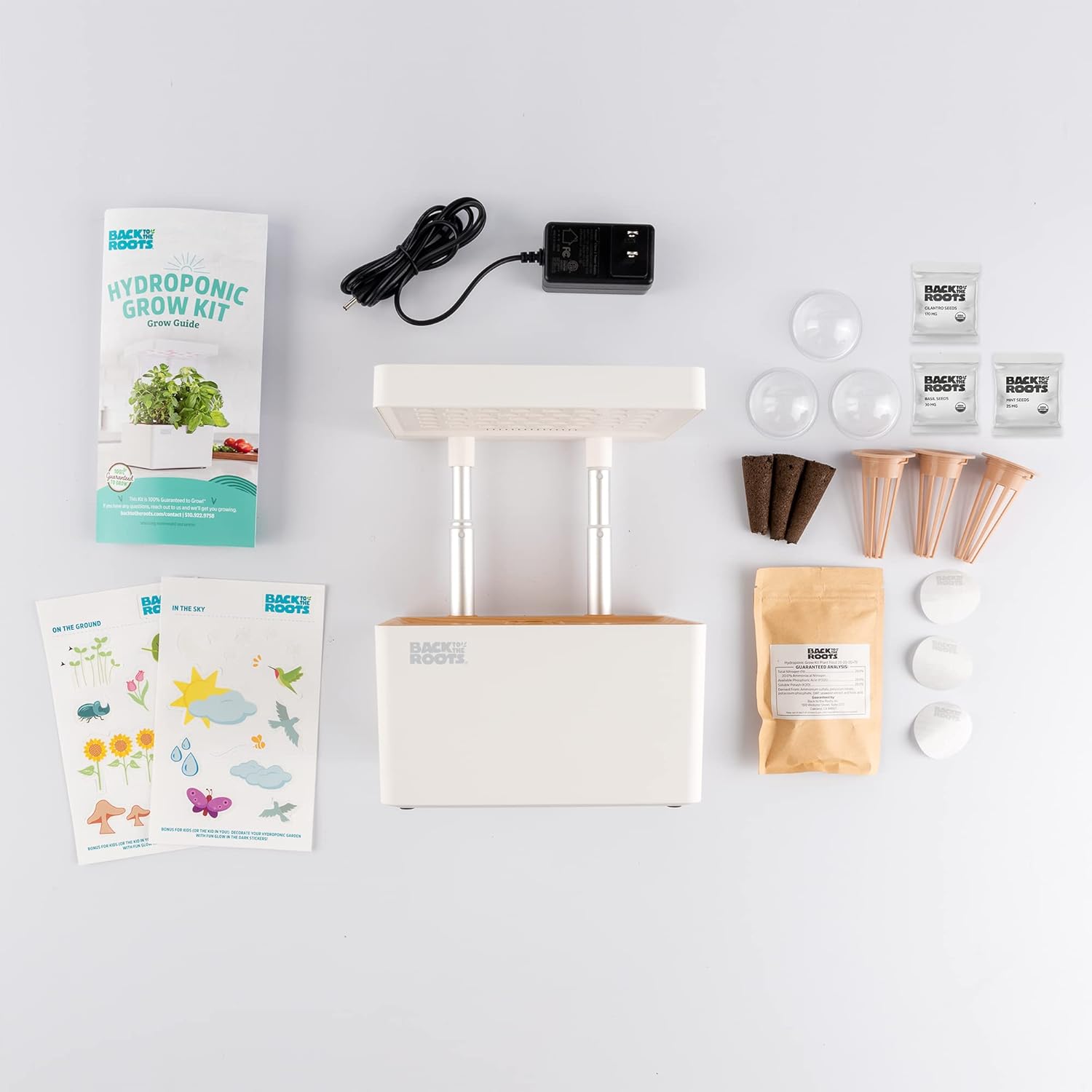 • COMPLETE COUNTERTOP GARDEN: This hydroponic system comes with everything you need to grow. Inside is a 3-pod grow system, automatic LED light, telescoping poles, grow medium, humidity germination domes, water level indicator, easy to use pre-portioned plant food, STEM gardening curriculum, fun stickers for kids, and a 100% Guaranteed to Grow promise! And the best part? It's made using recycled plastic — over 60 water bottles worth!