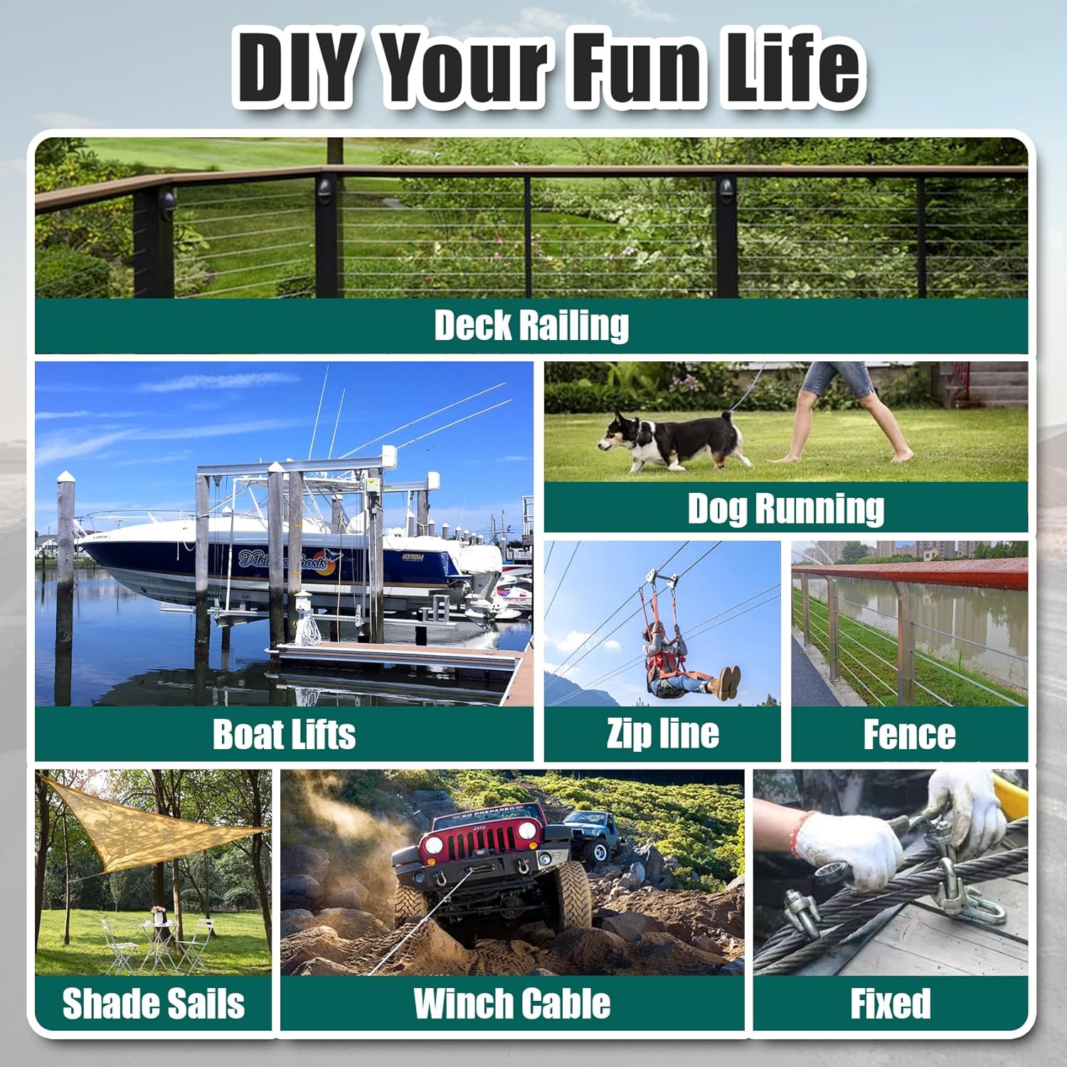 • Flexible structure: Stainless steel cable adopts a 7x19 strand structure, 6400 pounds of super load-bearing capacity, and can be freely cut to length.