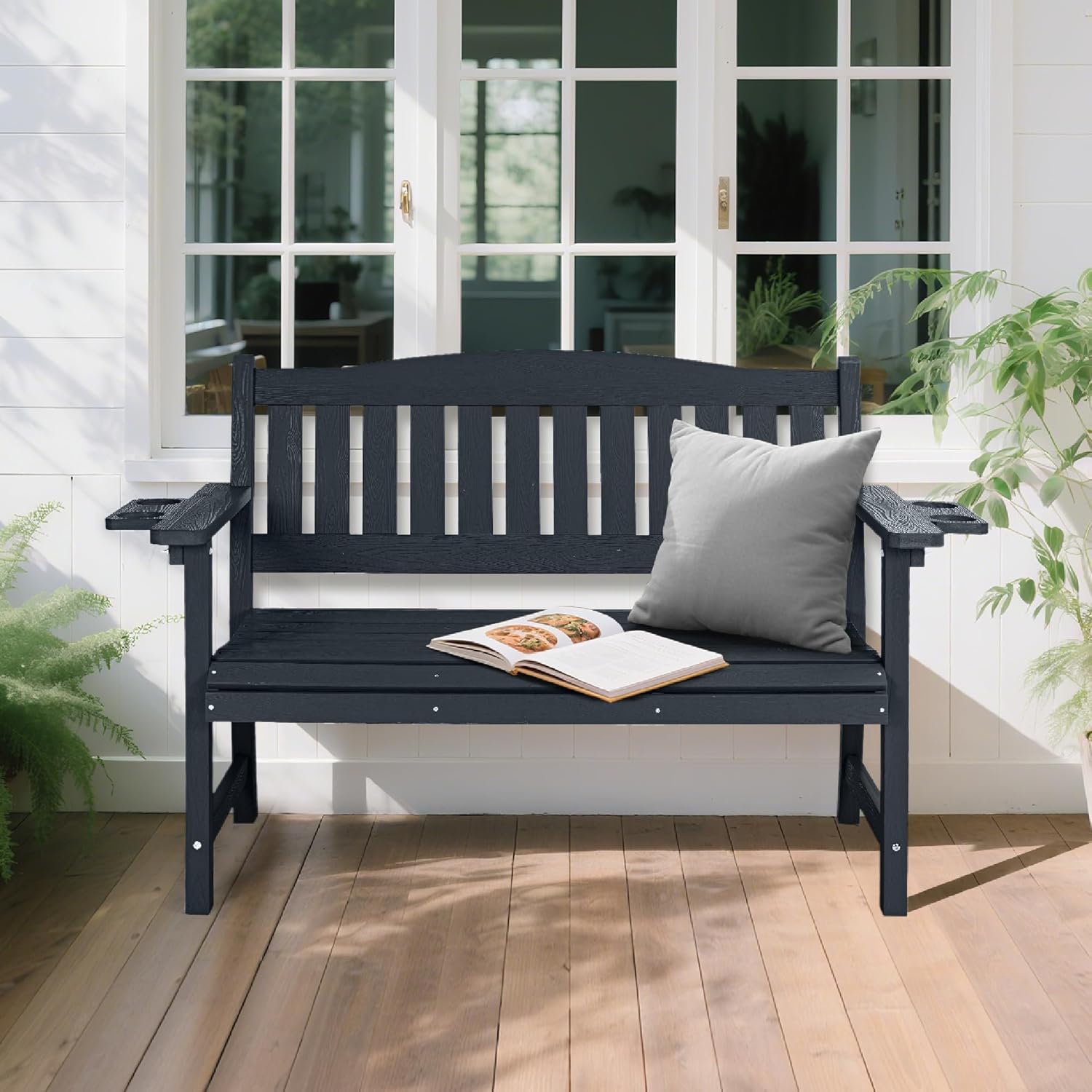 2-Person HIPS Outdoor Bench, Weatherproof Garden Bench with 800 lbs Weight Capacity, Artificial Wood Grains, Never Rot or Fade, Patio Benches for Garden, Porch, Balcony, Backyard,Park, Black