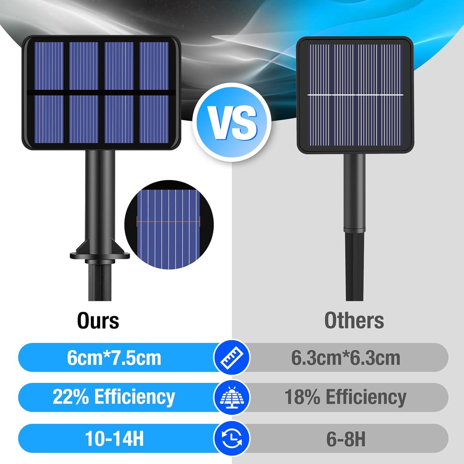 • Waterproof Design for All Weather: Light string and solar panel are IP65 waterproof to withstand any weather, either rain, sun, or snow. Safe for outdoor use, Don't worry about short circuits or bad weather damage (can't soak in water). Emit a blue white light after rain, romantic and beautify the yard