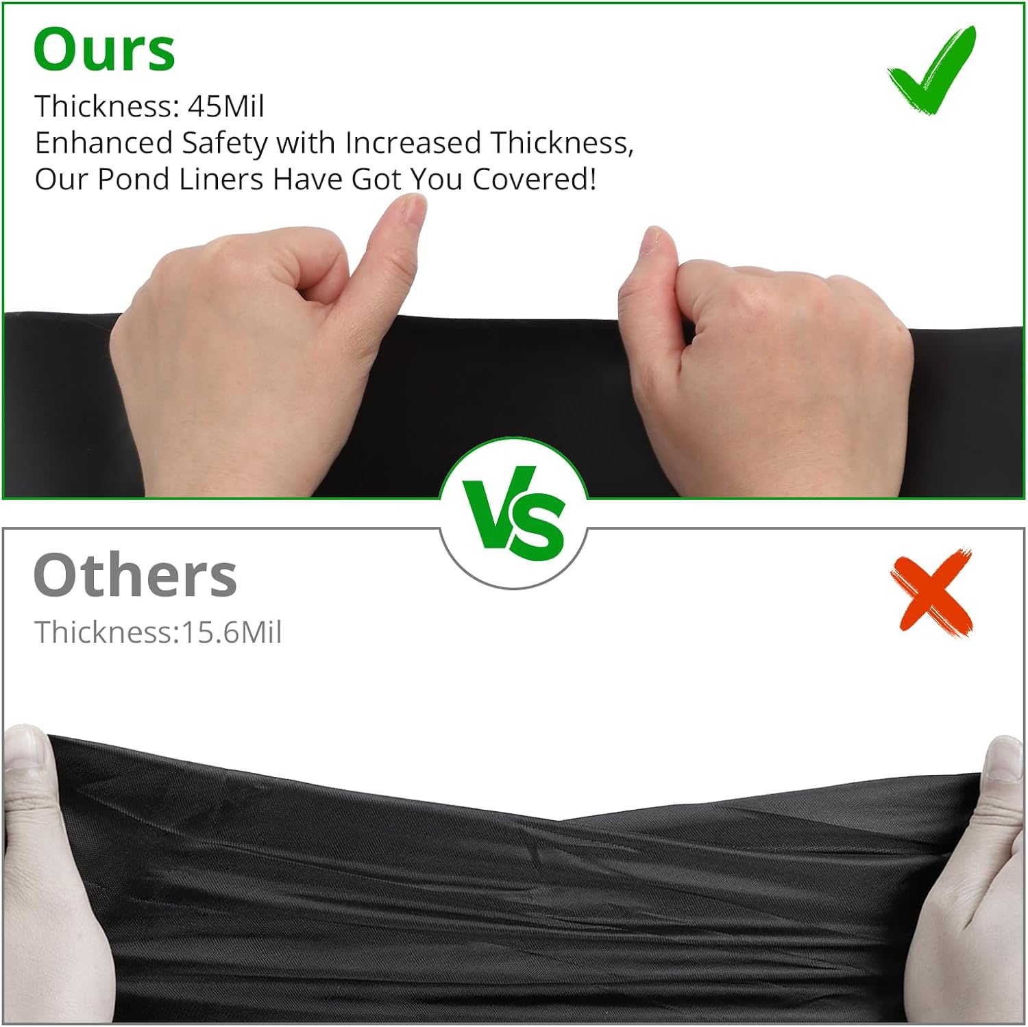 • Fish & Plant-Safe Pond Liner: Ideal Physical Barrier. Crafted with 45-mil thicker EPDM rubber, this liner provides a chemical-free, puncture-resistant layer for water containment. Maintain a stable aquatic environment—prevents water seepage with zero chemical additives. EPDM rubber material ensures long-lasting structural integrity for koi ponds and aquatic habitats.