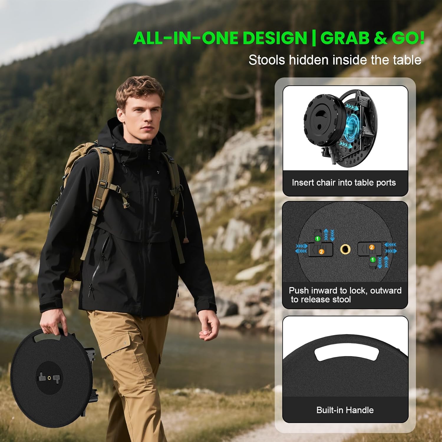 • 【Ultra-Portable & Compact】 The all-in-one set includes a foldable table and a retractable stools that store completely inside the table for ultra-compact transportation.