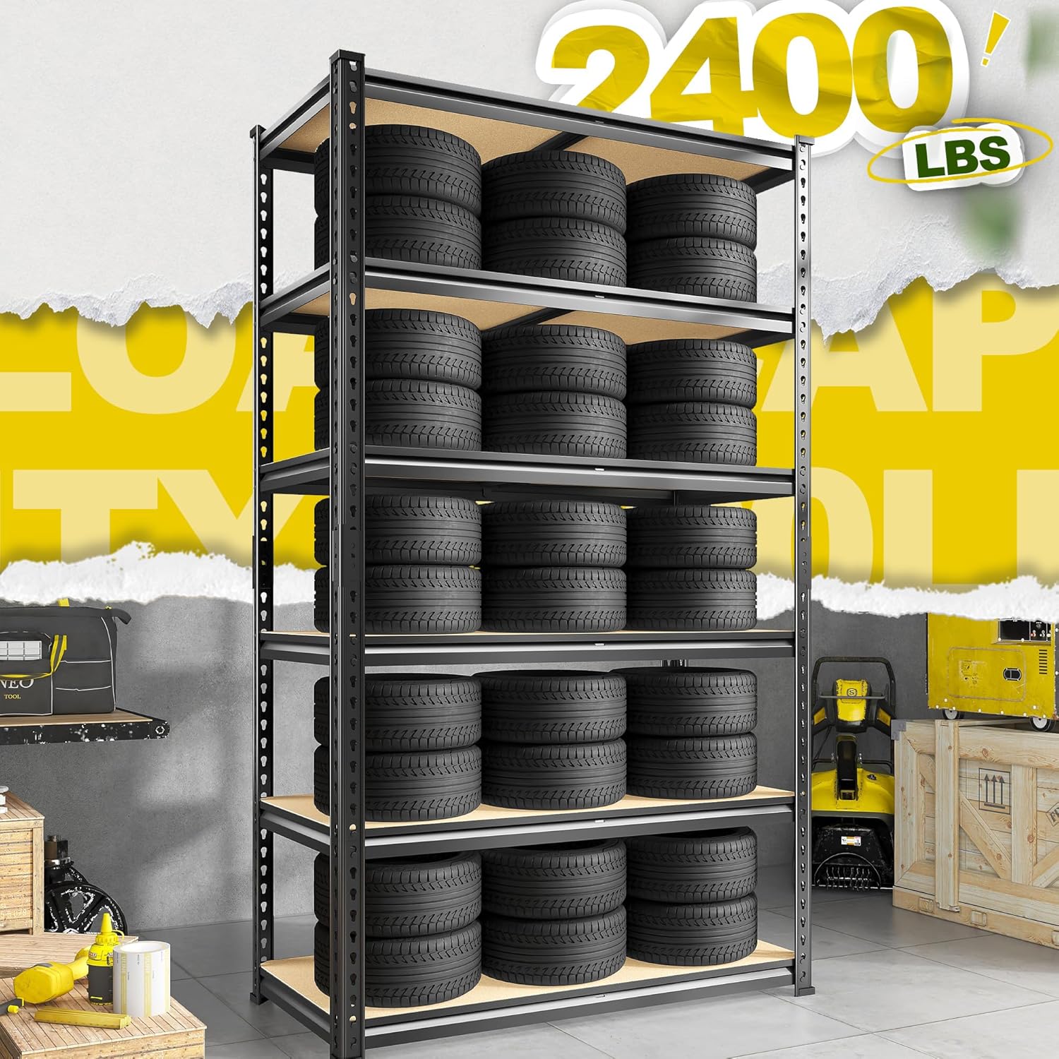 • 【2400LBS Garage Storage Shelves with Rolled Edge Design】The storage shelf is constructed from 5mm MDF and thickened metal frame. Rolled edge design of the metal column is not only thicker and better quality of the column, but also protect your hands from scratches. Each shelf with 1 rib beneath, each layer can hold up to 400LBS, with a total bearing capacity of 2400LBS. The robust design allows the garage storage shelves to stably hold various heavy items, making it easy to keep your space neat and organized