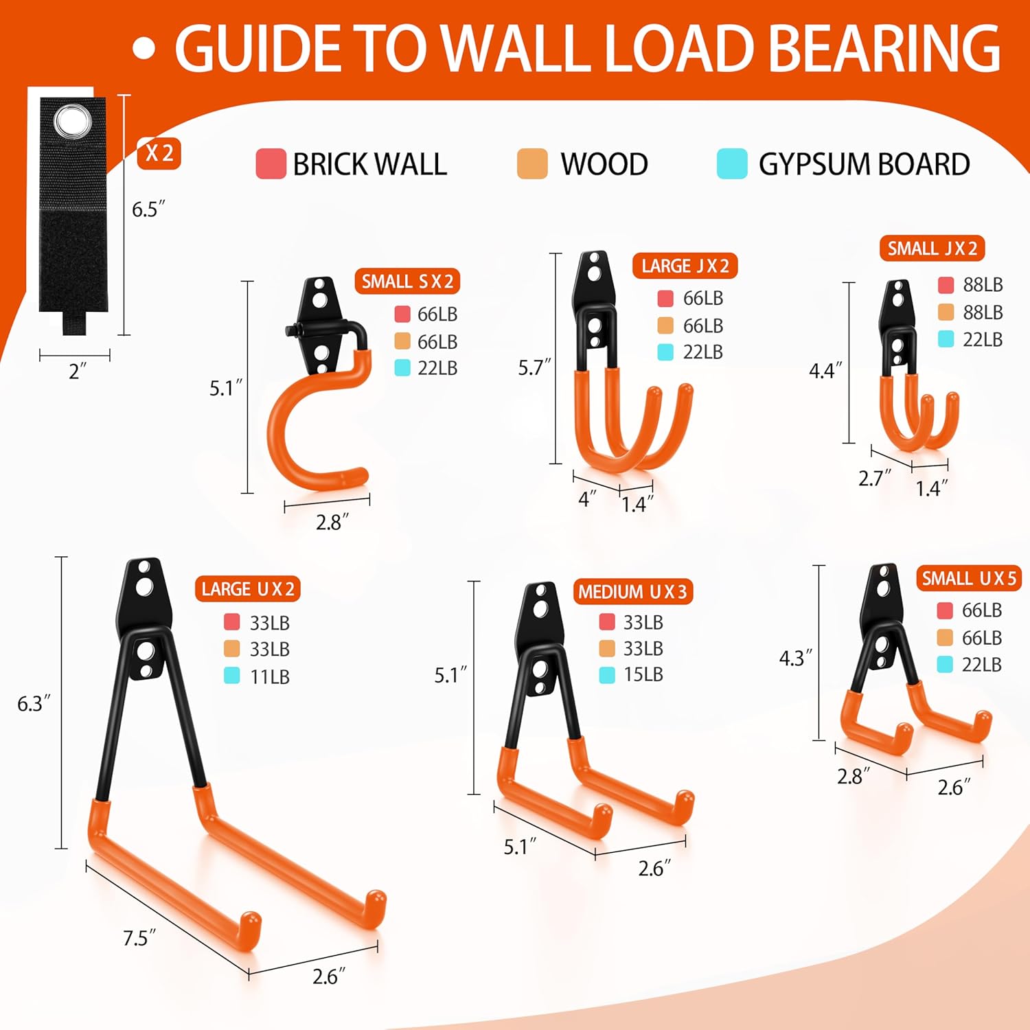 • Versatile Sizes: Our collection includes 16 heavy-duty garage wall hooks in 6 different sizes, featuring an assortment of small and large U-shaped, J-shaped, and S-shaped hooks, along with 2 extension strap storage belts for hanging various tools of different sizes and weights.