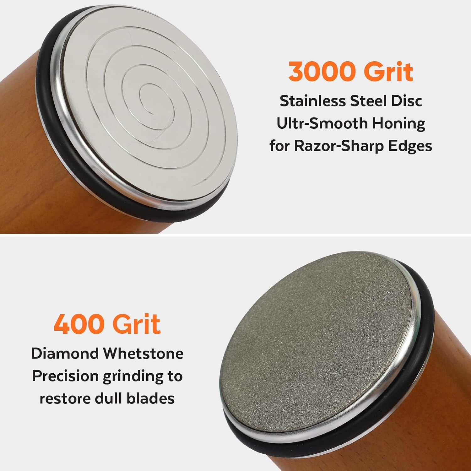 • 2-Stage Sharpening System - The 400 grit diamond disc restores dull edges and the 3000 grit Stainless Steel disc smooths and refines for a razor-sharp finish, perfect for maintaining high-performance kitchen knives.