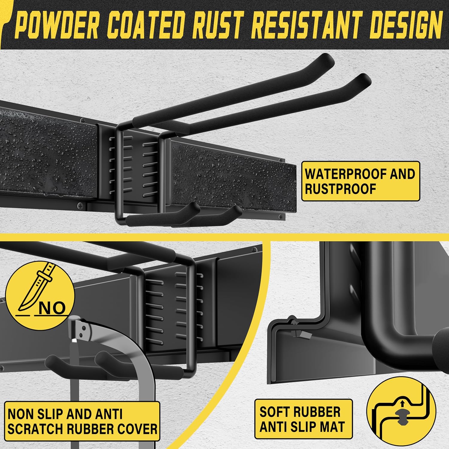 • VERSATILE TOOL RACK:Our Garage Storage System Isn't Just for Your Garage Tools;it’s Perfect for Arranging Garden Tools,Brooms,Hoses,and Even Sports Equipment Like Hockey Sticks And Ski Gear.This Multifunctional Storage Solution Maximizes Your Space.