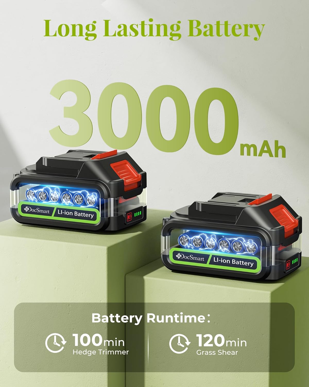 • Cordless & Portable: The small handheld hedge trimmer takes about 1.5 hours to charge and can work for 100-120 minutes. It comes with 2 pcs 1500mAh rechargeable batteries. 1 green light on the battery represents 25% power. Say goodbye to struggling with electrical cords and make your garden art easier