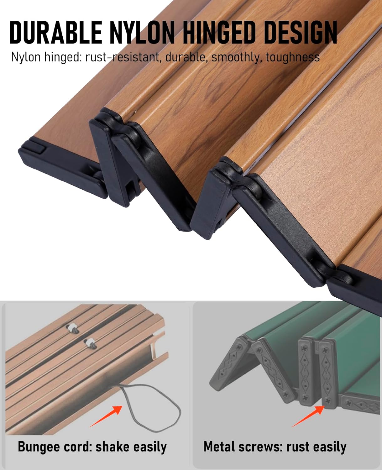 • Durable Nylon Hinged Design – Unlike other similar tables that use metal screws that rust easily or bungee cord that shaking easily, WildCall camp table use nylon hinged to connect each panel of the table, which is not only rust-resistant and durable, but also makes the table fold more smoothly and toughness