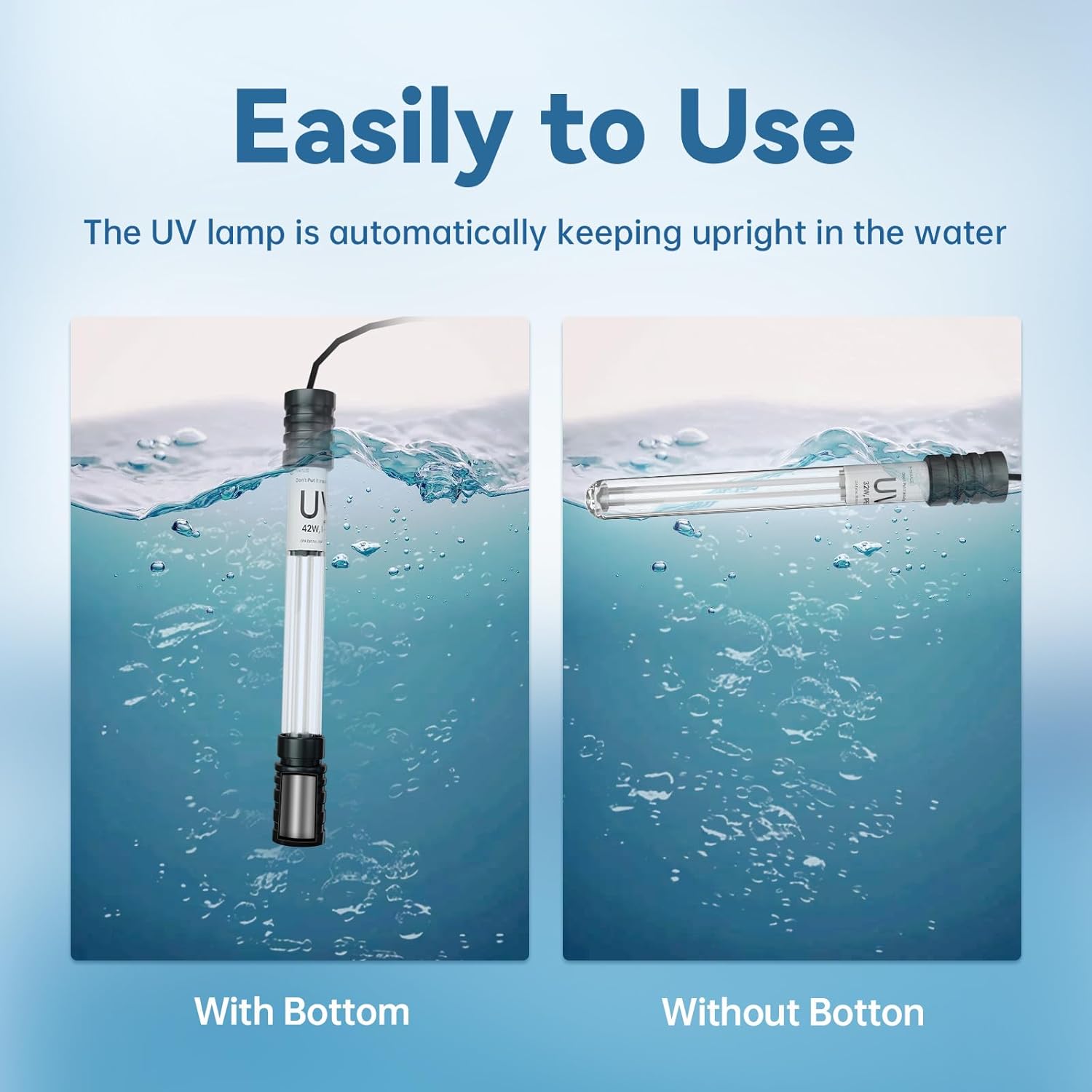 • Built to Last: The sleeve of UV pond filter is Crafted from ultra-clear, high-purity quartz material. this specially glass sleeve not only optimizes UV light for fish tank transmission for enhanced UV disinfection efficiency, but also survives deep-water pressure and hot-to-cold shocks for reduces the risk of cracking. Always disconnect power before maintenance, handling, or relocation.