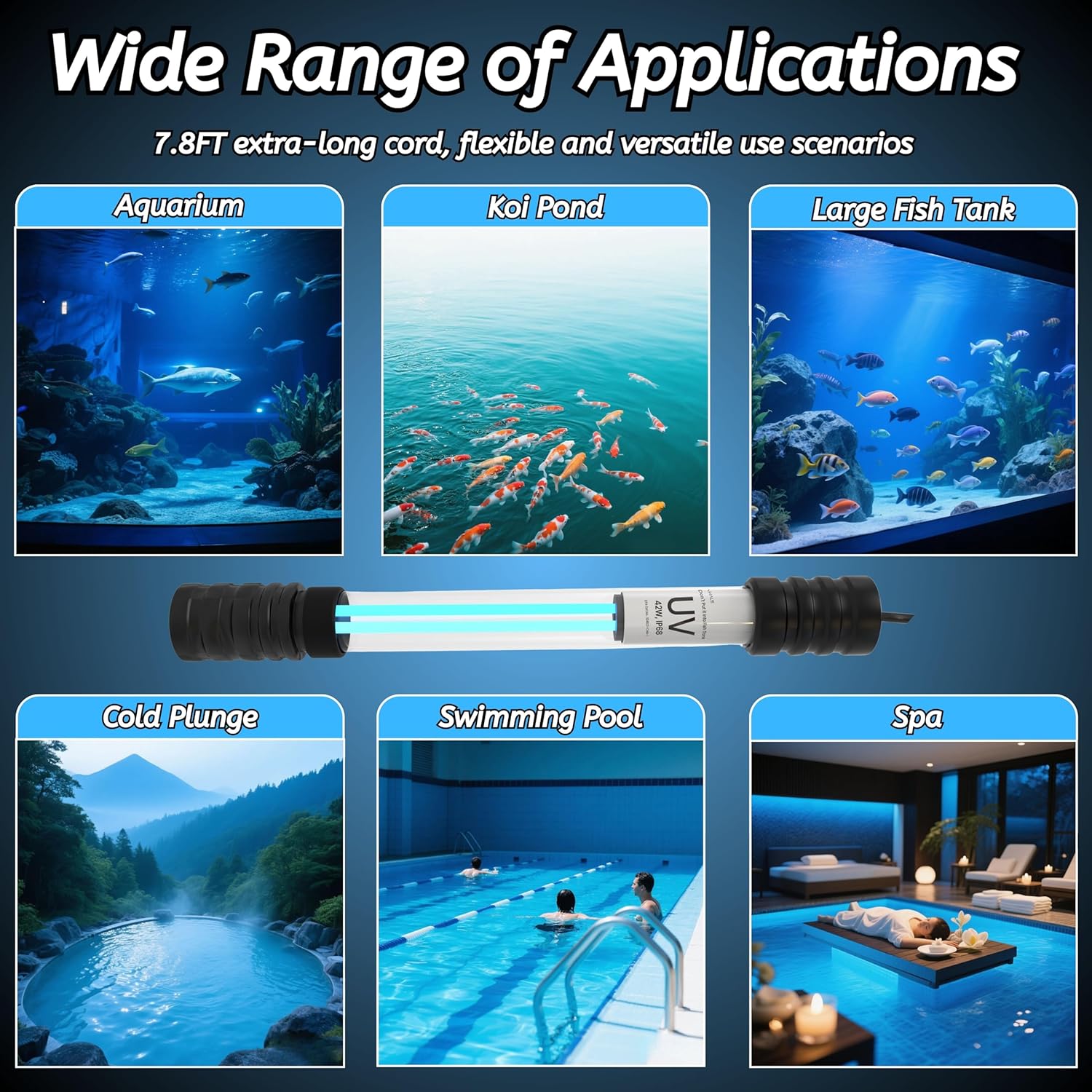 • Efficient: This professional pond UV light engineered with precision UV-C light at 254 nm effectively eliminates up to 99.99% of harmful algae, clears cloudy water and removes odors. Its 254nm wavelength is optimal for breaking down algae D-N-A, preventing reproduction. Designed for ponds, aquariums and spas, the UV light for ponds koi outdoor features a long 10,000-hour lifespan and includes a 240 cm power cord for easy installation.