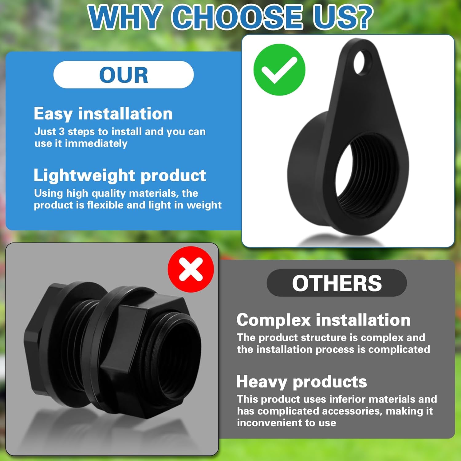 • Installation Outside the Bucket: No need to enter the bucket,You can complete the rain barrel spigot installation operation outside the bucket by simply drilling a 1-1/4-inch hole, inserting the rubber joint into the hole, and then screwing on the rain barrel spigot to complete the installation
