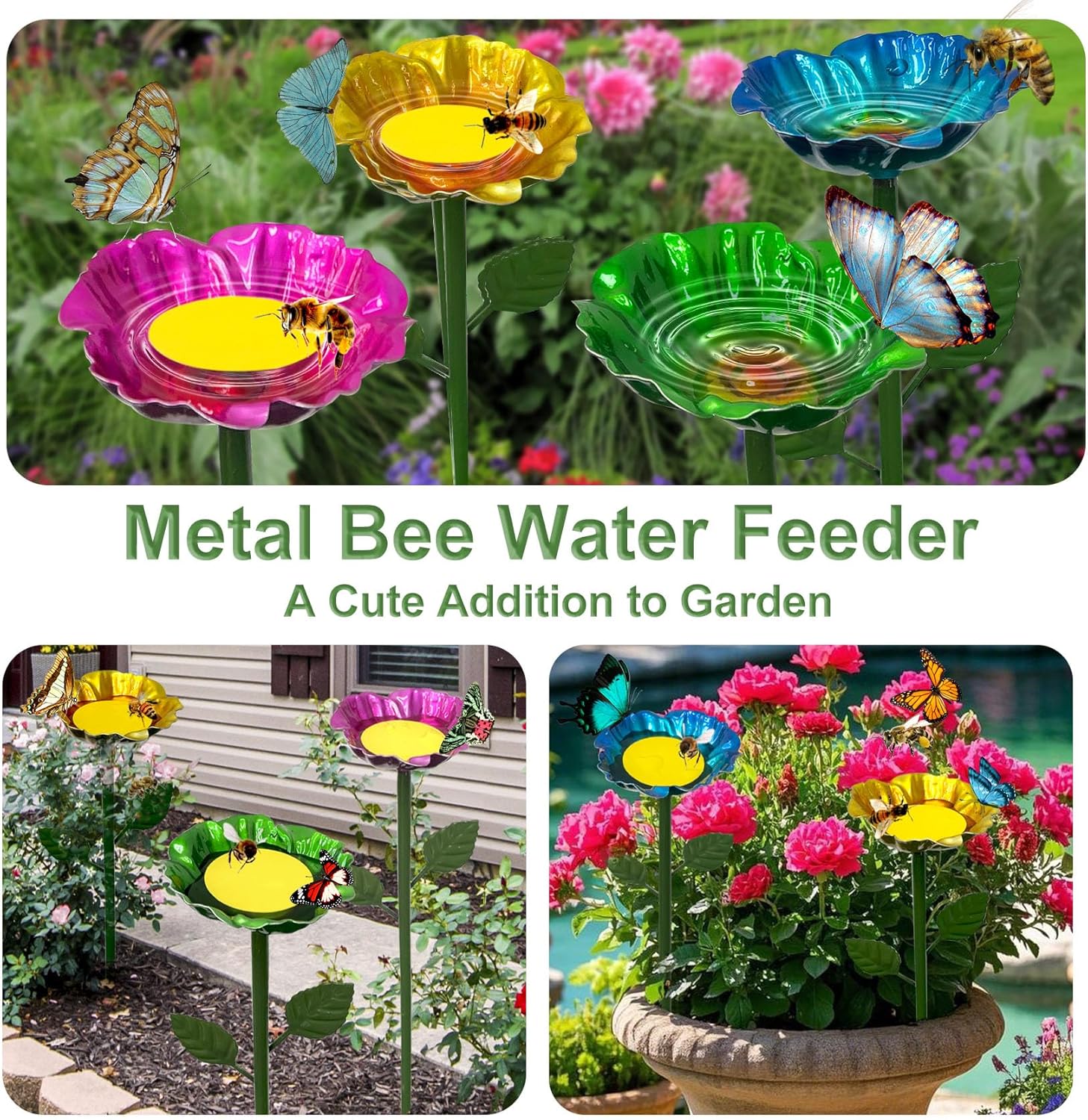 • Nature-Inspired Design in 4 Colors: Our bee watering station for garden features lifelike flower shapes and leafy stems in four vibrant colors—an eye-catching butterfly feeder and bee bath that doubles as charming metal garden decor