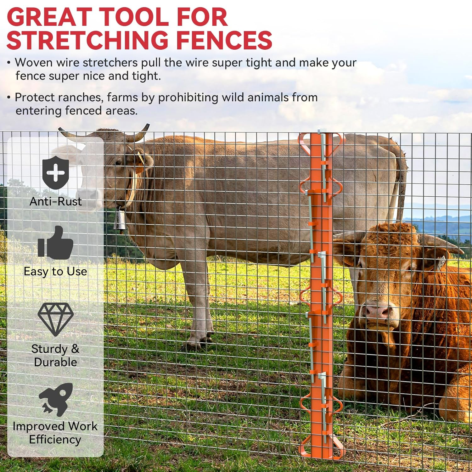 • Practical Woven Wire Fence Stretcher: This wire fence stretcher can tighten various fabrics and is suitable for multiple fencing materials, including chain-link fencing, barbed wire, and welded wire.